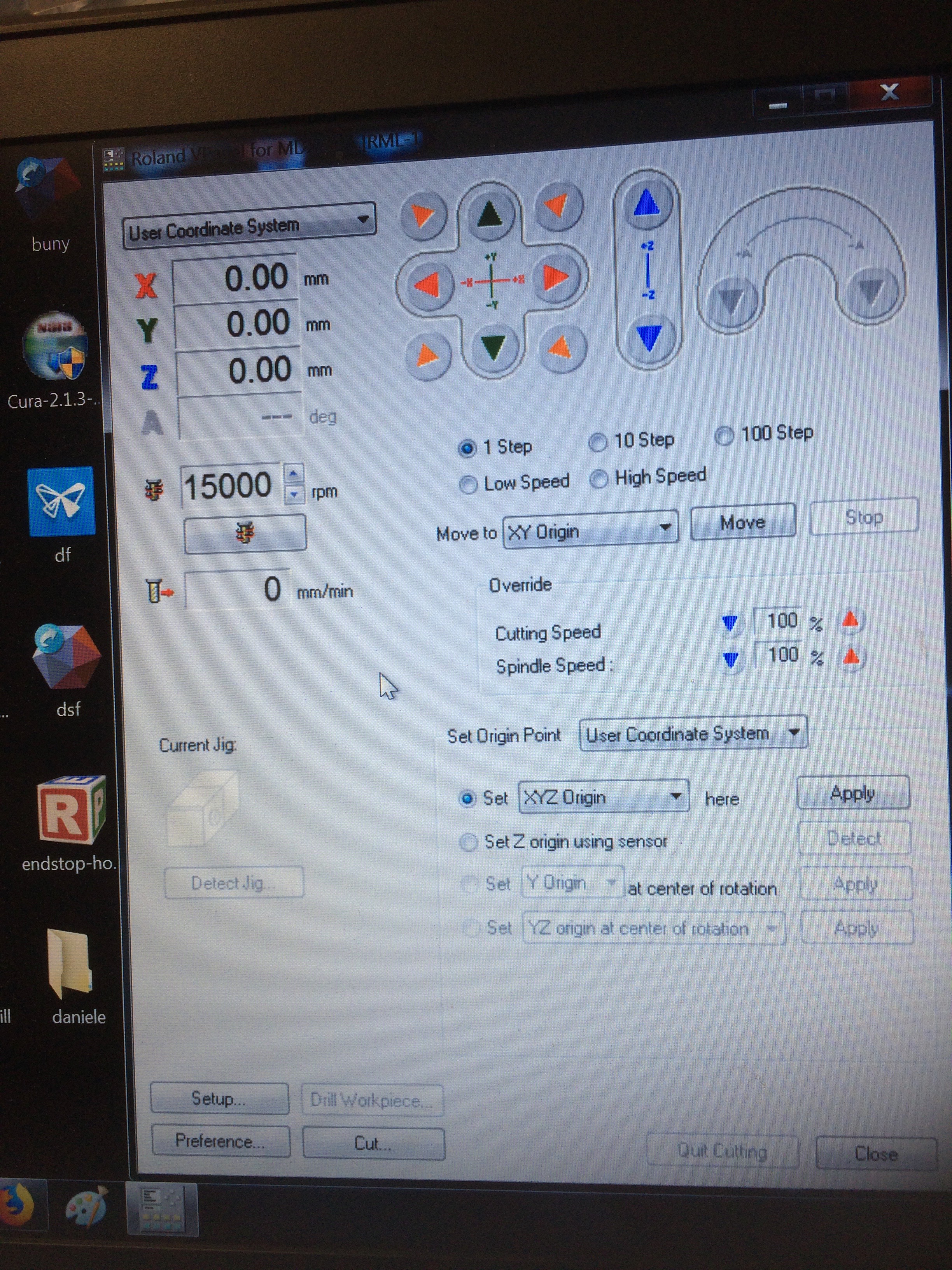 The software that runs the mill is called VPanel. Its GUI is quickly understood. The controls are used to move the table in X and Y, and the head in Z. Before beginning the cutting, the head is placed somewhere central on one of the blank PCBs. The hard part here is touching down in the Z direction. It is possible to convince yourself that you can hear the mill just touching the surface, but better is to move it a bit in x or y and watch for the formation of a bit of copper dust. In my case, I had to stop and start the cutting a few times to dig further into the surface of the copper, until I found a zero which removed all of the copper but didn’t dig too far into the underlying PCB. Once the final zero Z is achieved, then use the “Set Origin Point” section of the GUI to zero the axes.