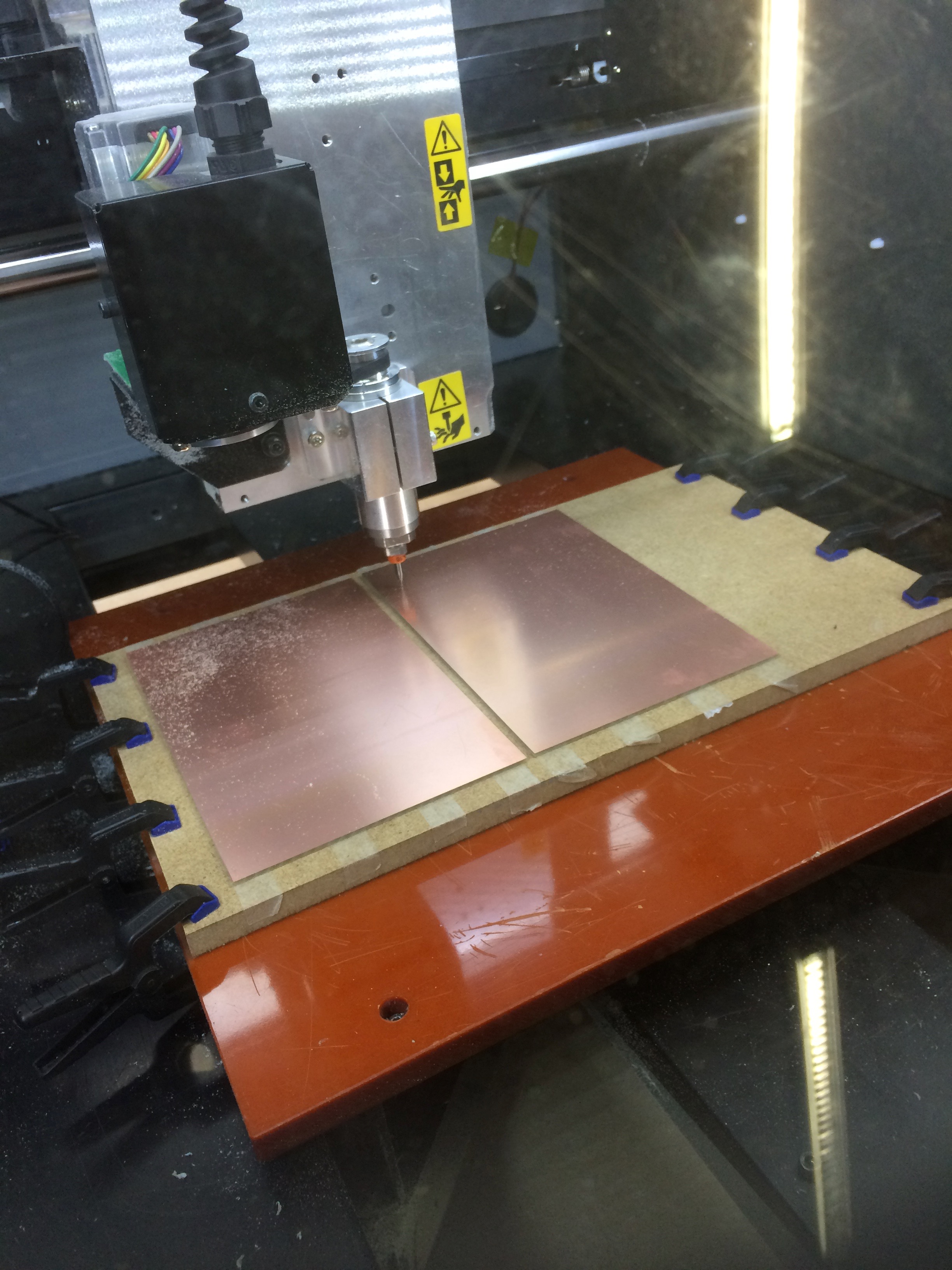 PCBs taped to MDF and clamped in place.