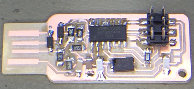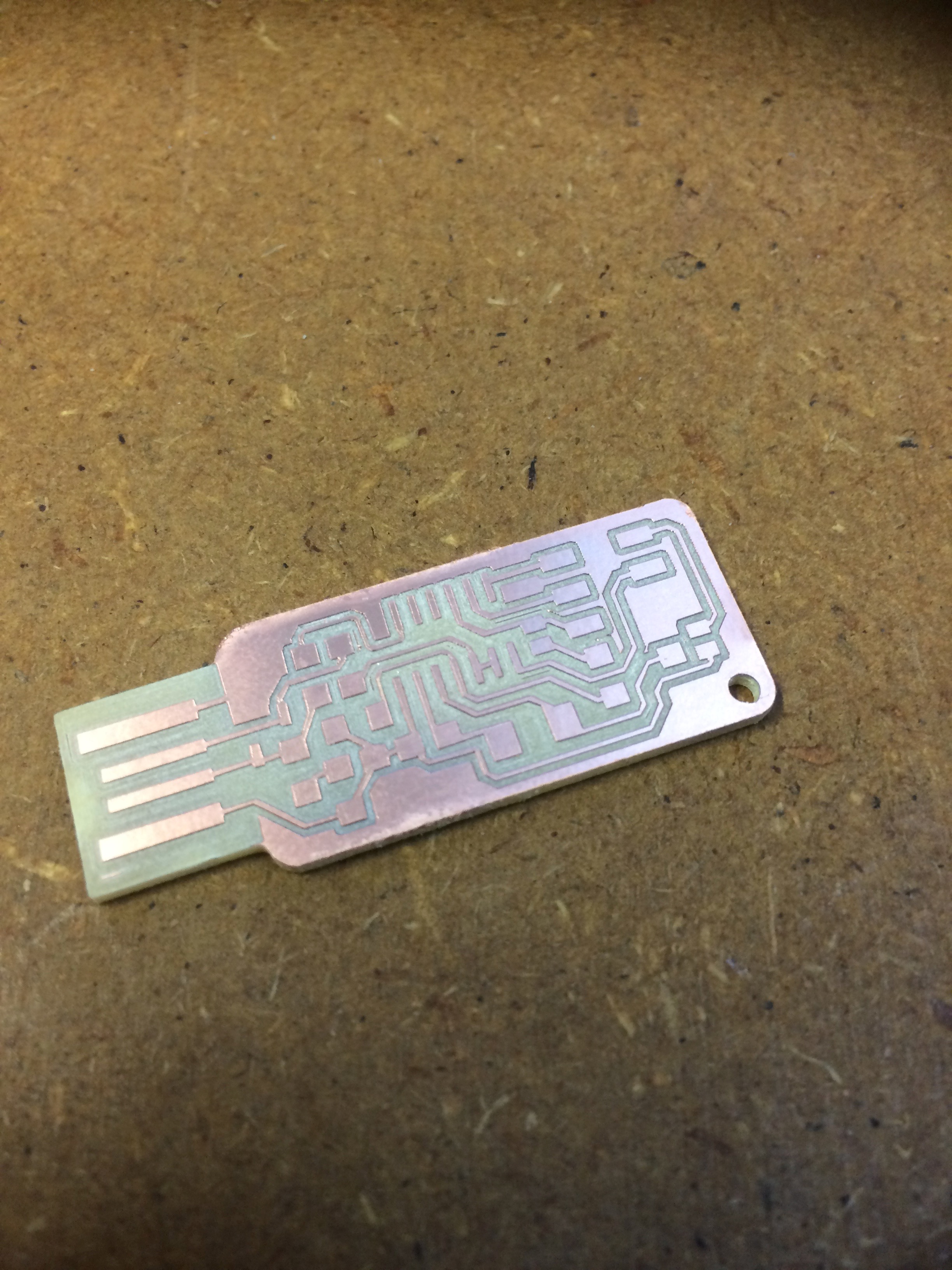 When all is set, then hit “Cut” in the bottom right corner, select the .rml file to be cut, and the machine goes to town on the copper. Change tools after the tracks have been cut, manually find a new z0 using the jog commands on the VPanel, then hit “cut”. The result is below: