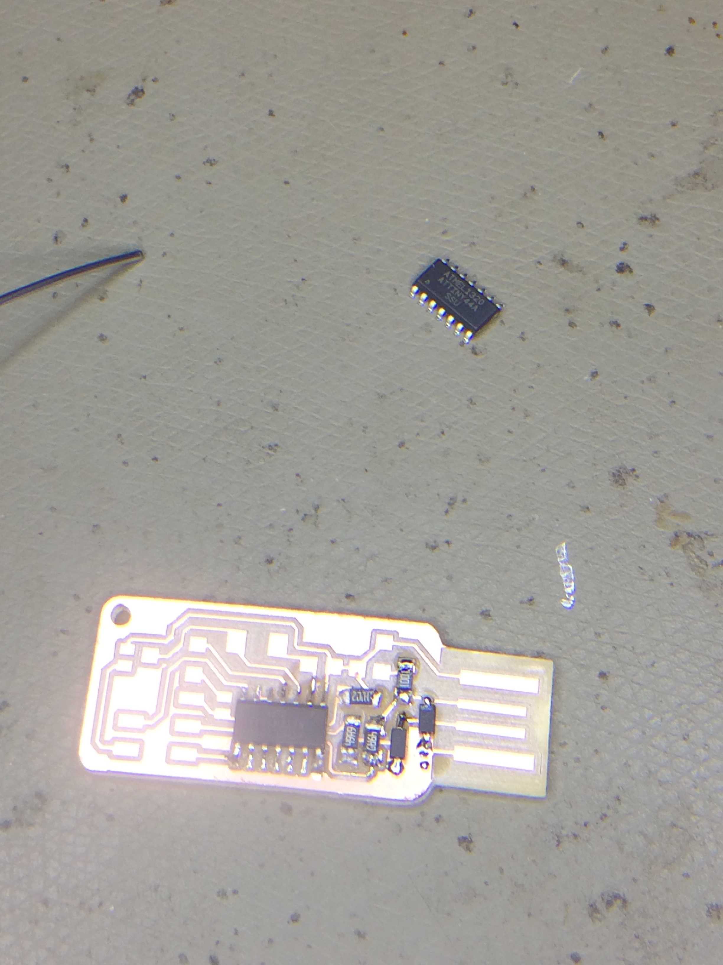 Board in programming state - note the solder jumper between the chip and the 6-pin header.