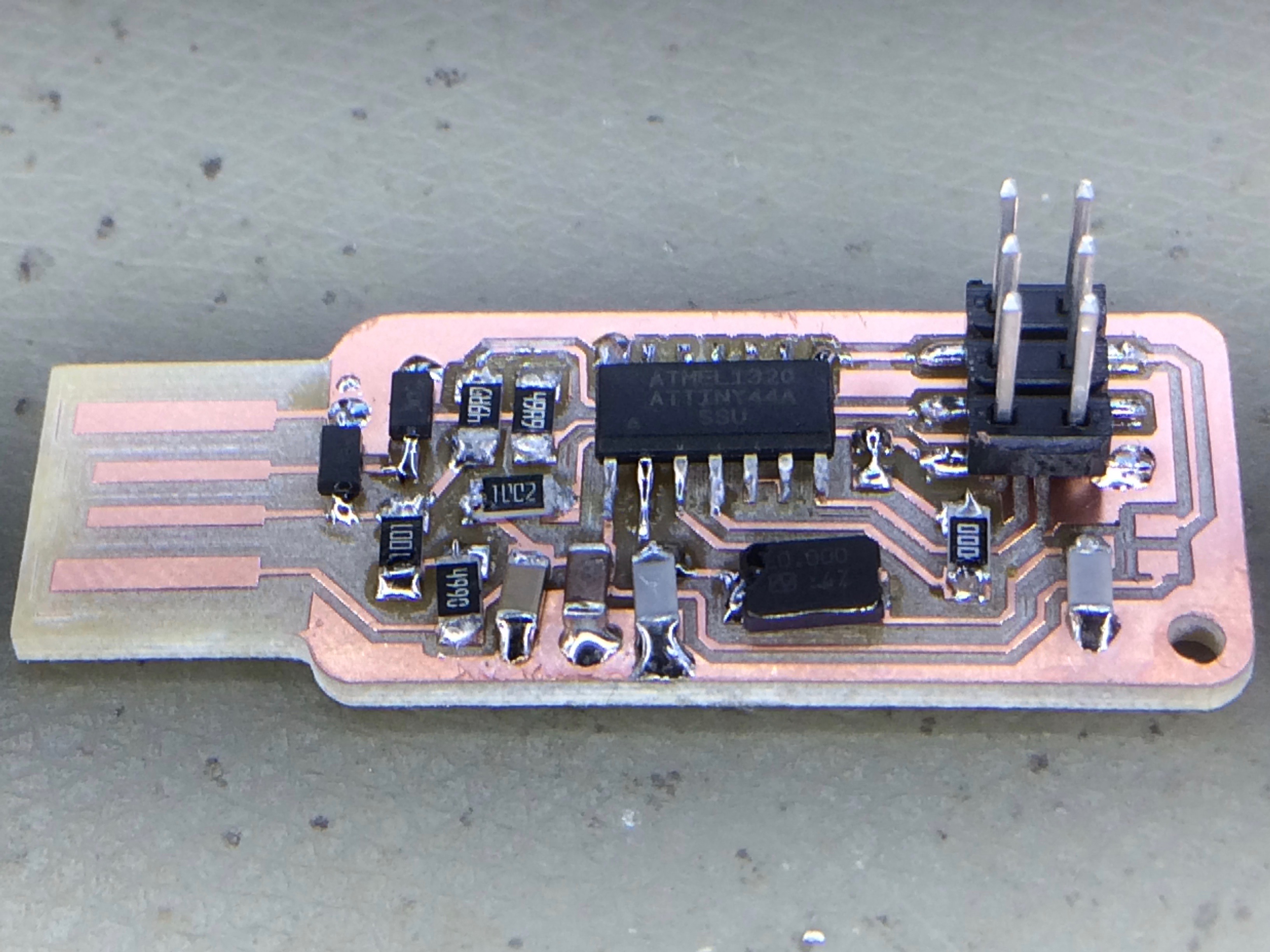 After all of the elements were soldered, I checked every connection with the continuity setting of the multimeter, making sure that the PCB tracks were in fact connected to the legs or ends of each of the components. I paid careful attention to the VCC and ground elements of the USB connector and connector pins - any shorts there and it would be lights out for the computer motherboard (I’ve seen that happen before, and not enjoyed the experience).