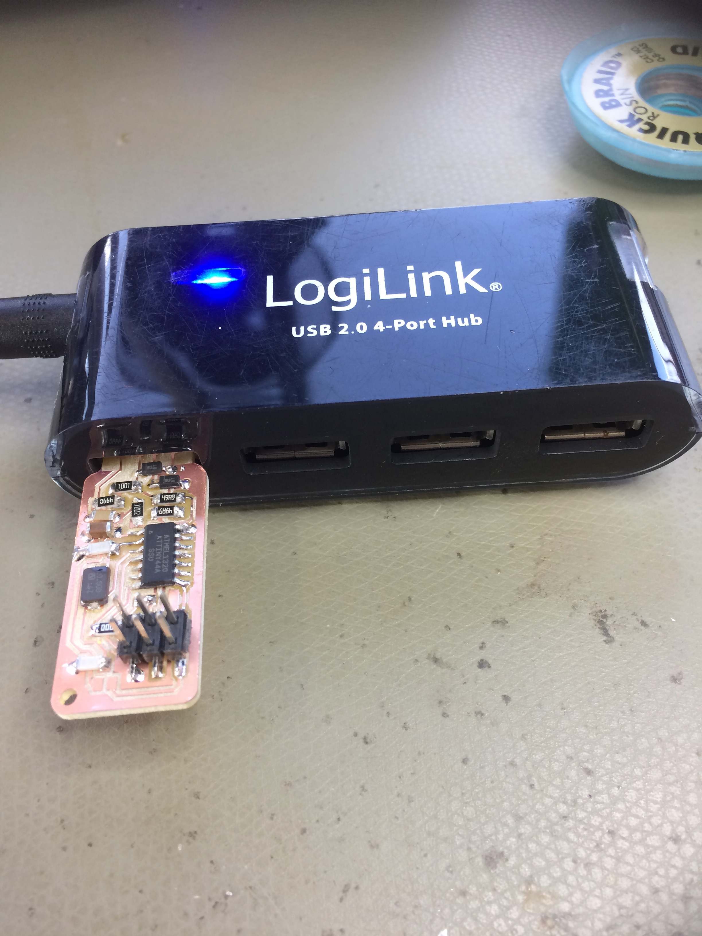 make fuse to set the first settings in a blank chip got the ok after it uploaded the first settings test make program got the ok after a complete upload disconnect the programmer, unsolder the jumper check that the FabISP appears in Apple:About:SysReport:USB