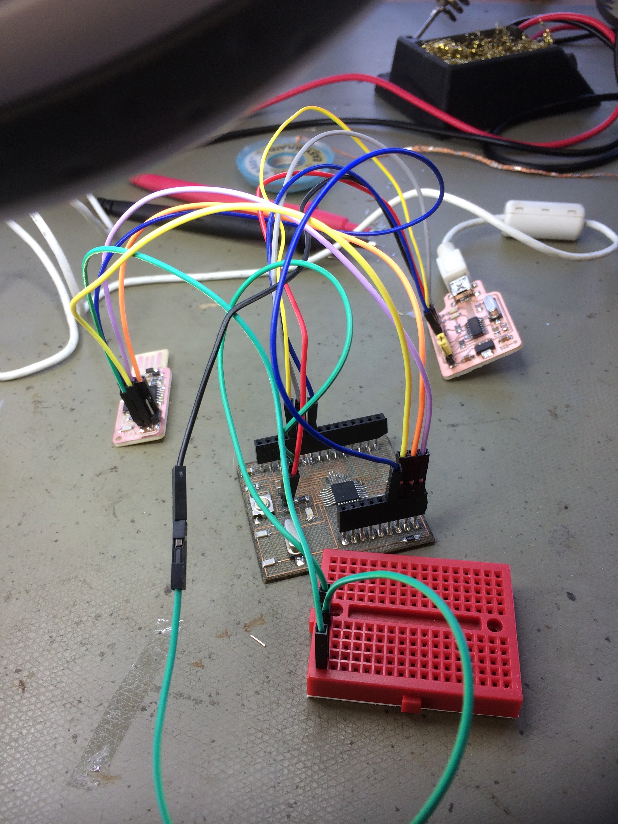 The ground had to be divided between all three chips, so I used a breadboard for the temporary connection. The final wiring looked like this: