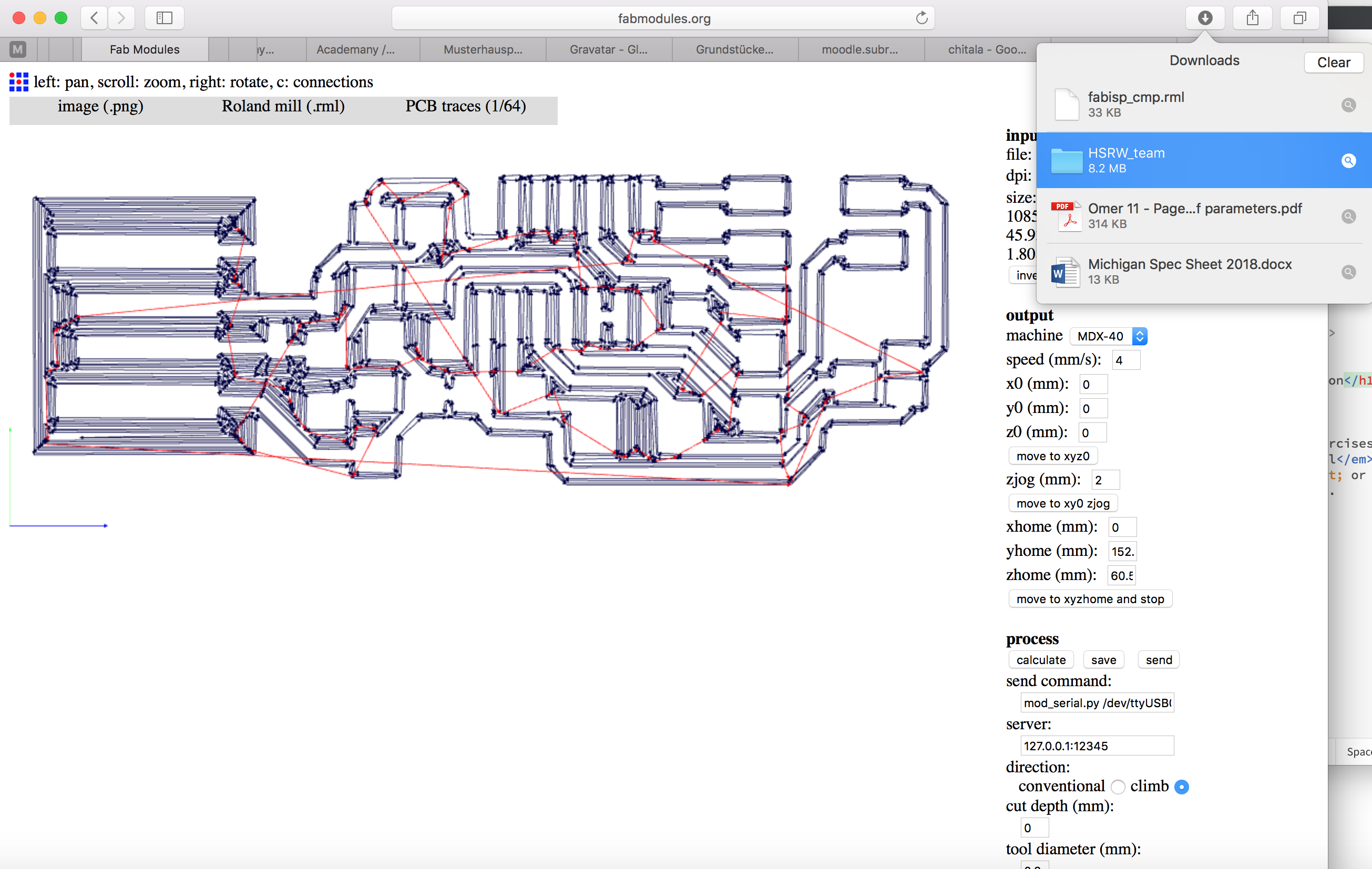 The black and white images need to be turned into a set of CAM instructions for the CNC machine to use. This was achieved using the tool on fabmodules.org. The first prompt wants the filename of the circuitboard image. The second prompt is for the type of mill (in this case a Roland mill, model MDX-40). And the third prompt chooses the process. The first pass (shown below) is of the tracks on the board (cut first!).
