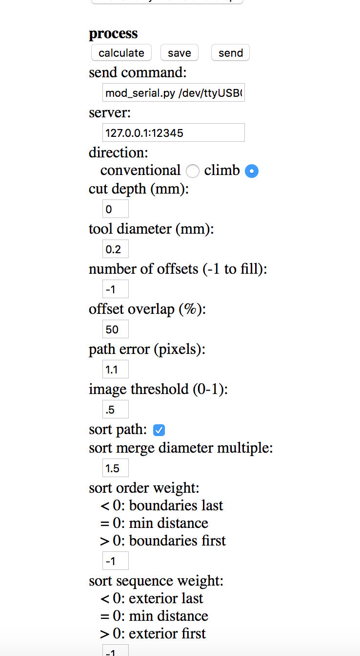 The next step was to set the rest of the parameters. First zero the x0, y0 and z0 values above, set the speed to 4mm/s, then set the process variables as below. Tool diameter is 200um. The offset overlap controls how many passes the tool makes over each area - here each “lawnmower” pass covers 50% of the previous pass. The “number of offsets” is set to -1 to make sure all of the copper between the various tracks is removed. Then click calculate to see the calculated CAM tracks. Click save to create the file needed for the CNC mill.