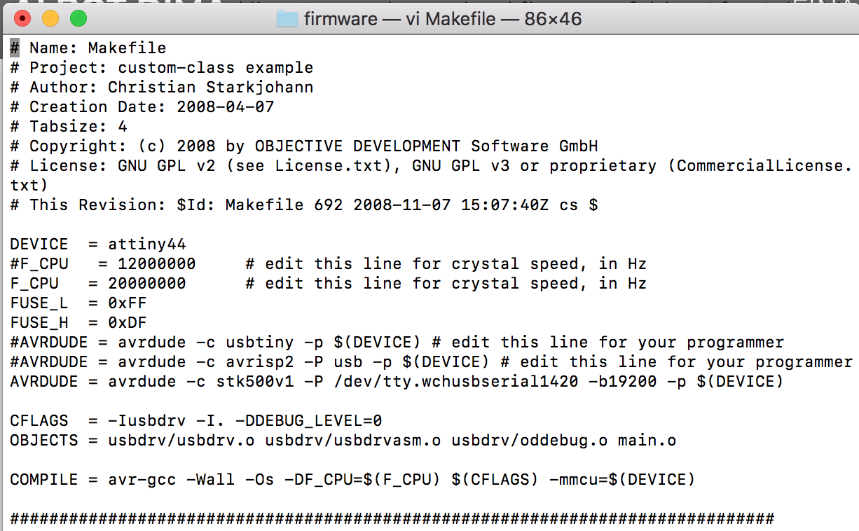 . To confirm that the Satsha-TTL was actually working with the Mac and to identify the name of the USB port, my instructor recommended I just use the Arduino IDE. Once updated to version 1.8.x for HighSierra compatibility, that software confirmed we had a connection to the Satsha-TTL and listed the port as /dev/tty.wchusbserial1420. I then modified the Makefile to work with it (using Dima’s documentation). This involved editing one line of the Makefile using vi. The line in question is the third AVRDUDE line in the pic below.