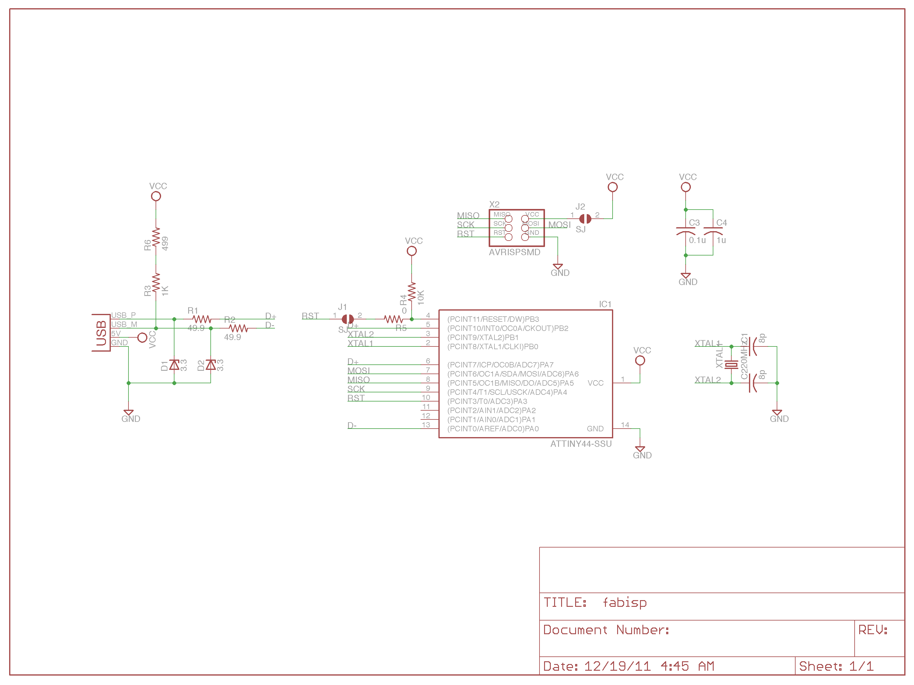 The FabISP is built around the ATtiny44 microcontroller. Andy makes the PCB layout available on his website, along with a simple circuit diagram, so that we FabAcademy students (and presumably the world at large) have a place to start. The circuit diagram (reproduced from Andy’s site below) is really very simple. It consists of a single chip (the ATtiny44) with a 22 MHz crystal and a USB connector. The USB data lines are connected through zener diodes and series resistors to convert the logic from 5V to 3.3V (the breakdown voltage of the zeners). The VCC positive power supply to the chip is filtered through a pair of capacitors to ensure it’s clean and reliable.