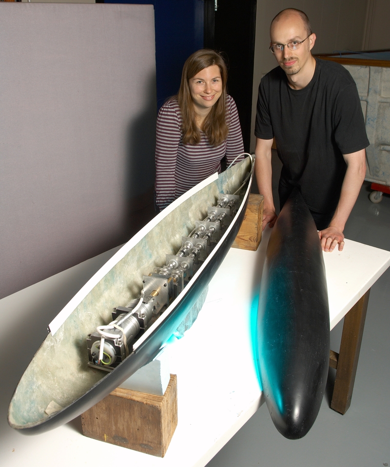 The robot will be equipped with a sensor suite to monitor its attitude in the water and the flow of water over its skin, possibly using an artificial lateral line we’ve developed in the lab. The sensor data will be used to control the three motors and probably also some steering fins.
