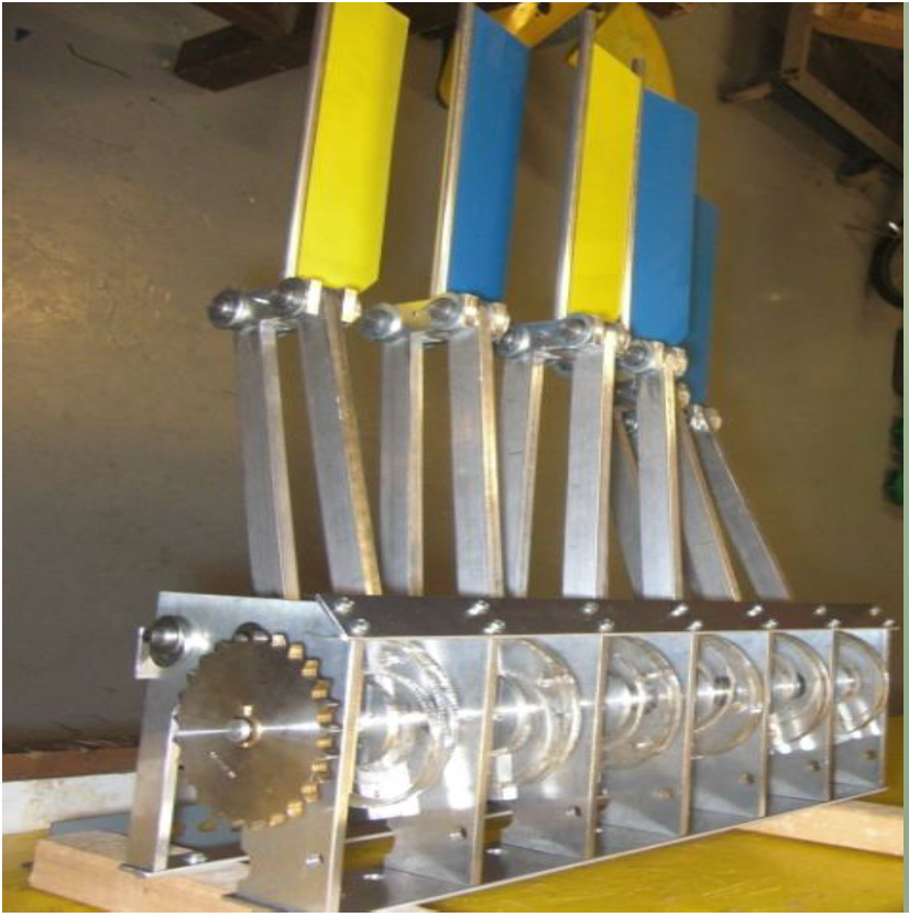 The second morph of the wave drive was designed for a submarine called Ronquil, named after a fish which propels itself with a wave on its dorsal fin. Here the crankshaft was replaced with a set of internal cams which drove the fins through four-bar linkages such that they translated laterally instead of rotating. This increased the amplitude and reduced the off-axis flow.
