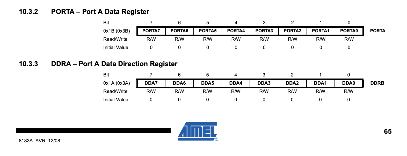 Each port pin consists of three register bits: DDxn, PORTxn, and PINxn.