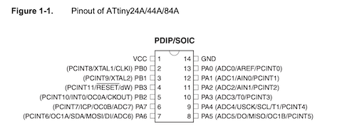 - ATTiny 44 is working in 8bits - Rewritable for 10000 times - There are two PWM Channels, Each - Operating Voltage:1.8 – 5.5V. This means I can use this with at least 2 AAA battery. - PIN assignment