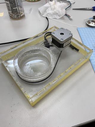 First, I put 5 gears together since we need the height to adjust the heights 2 stepping motor. so we decided to assemble it with glue. so before make it production we tested several types of glues. one is 10 seconds and the other one is in 2 minutes. so we use a small part small part of acryl part with 10-second glue and it seems like too fast to getting together because we need to adjust the gears accurately so then I tested 2 minutes-glue.
