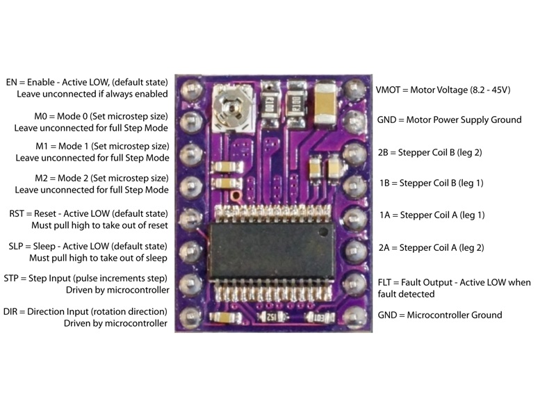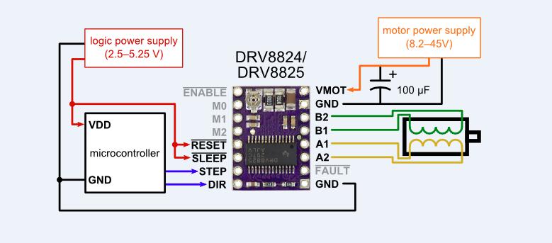 The DRV8825 can supply up to 2.5-A peak or 1.75-A RMS output current (with proper heatsinking at 24 V and 25 degree C).A simple step/direction interface allows easy interfacing to controller circuits. Pins
