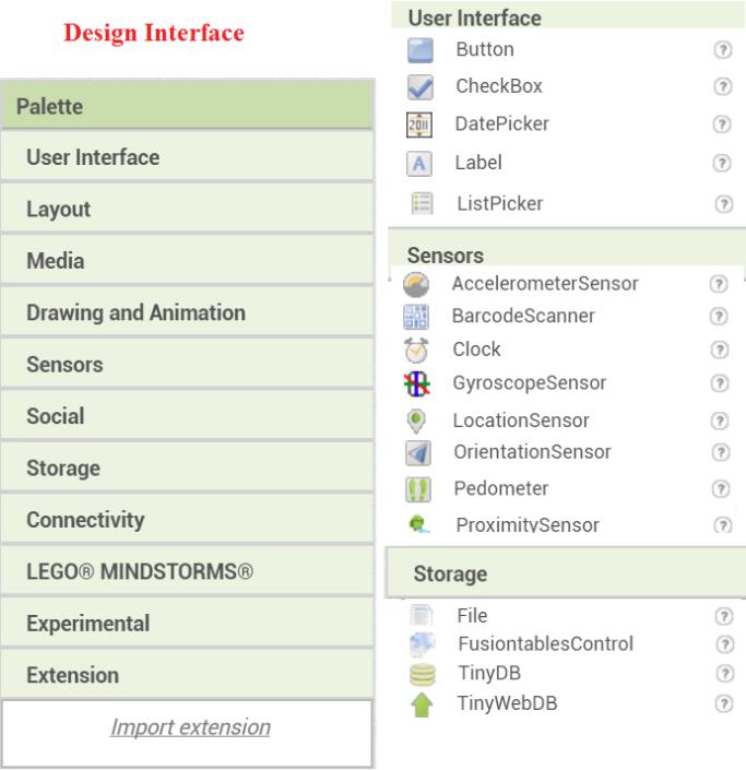It also contains the components which are inserted in the Components hierarchy and their related functions. For example a button is inserted in hierarchy, the blocks menu will contain the button and its subsequent functionality like onClick, OnHover etc