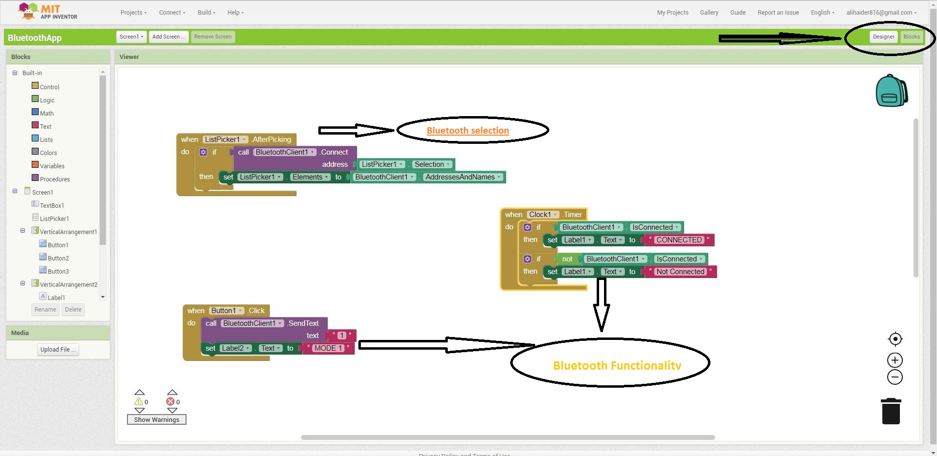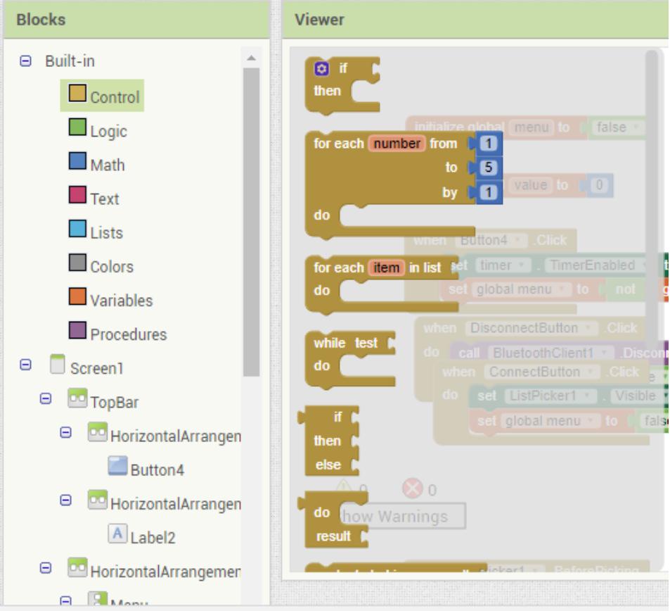 Once all the require button, labels, dials, systems features like timer, connectivity modules are setup we are ready to switch to the blocks mode and start designing workflow of your app.