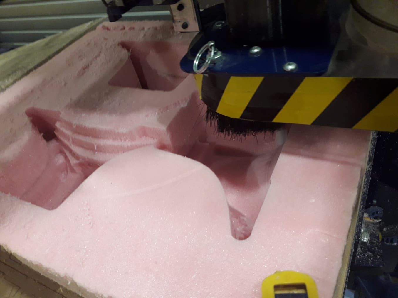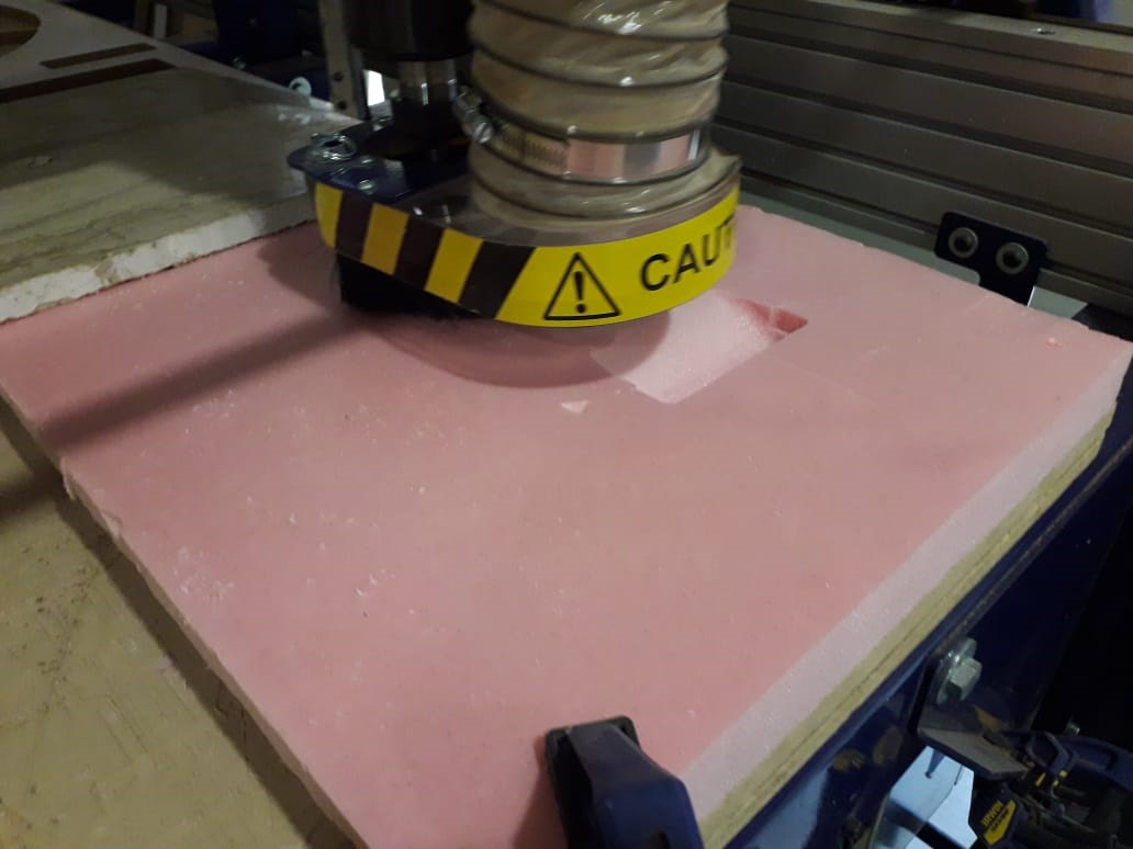 The next step was to cut the model on the 40mm foam, the toolpaths were generated and then used in cutting on shopbot. shopbot at work of roughing & finishing the model