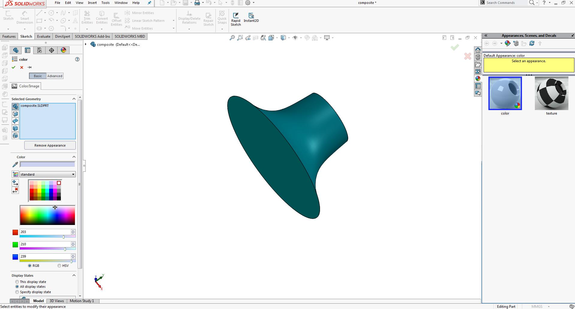 In the next step I click on the edit appearence and colored the lamp in solidworks.