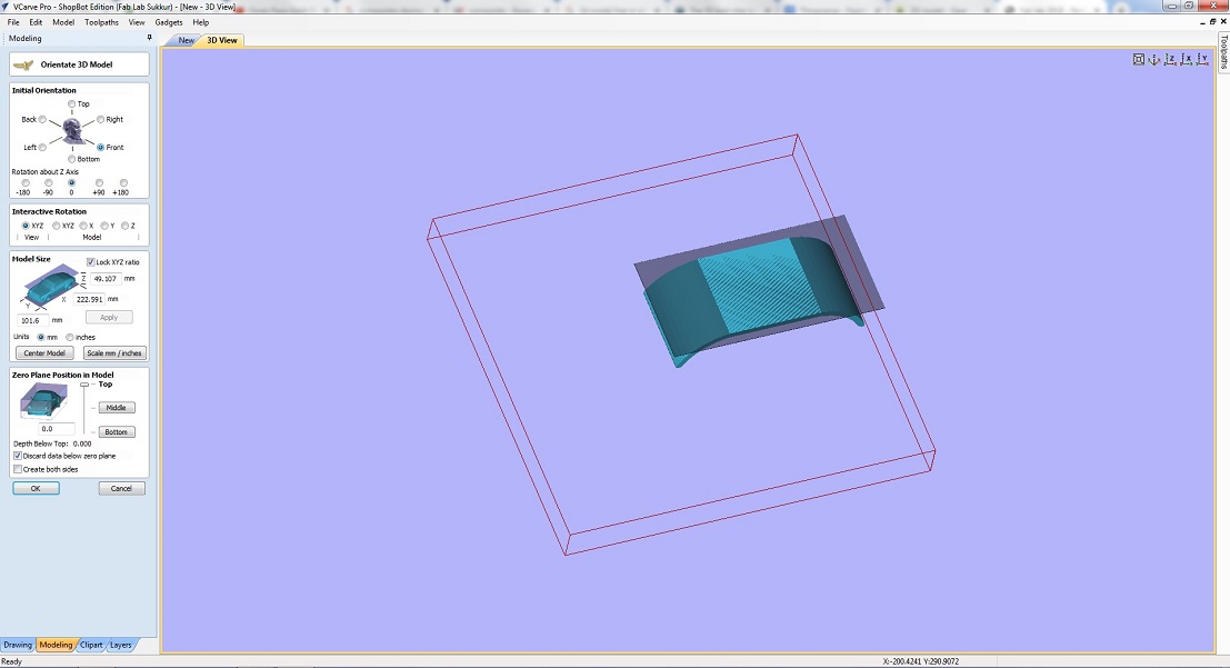 • When the .stl file is imported on Vcarve now set the initial orientation, interactive rotation model size and other things and press ok.
