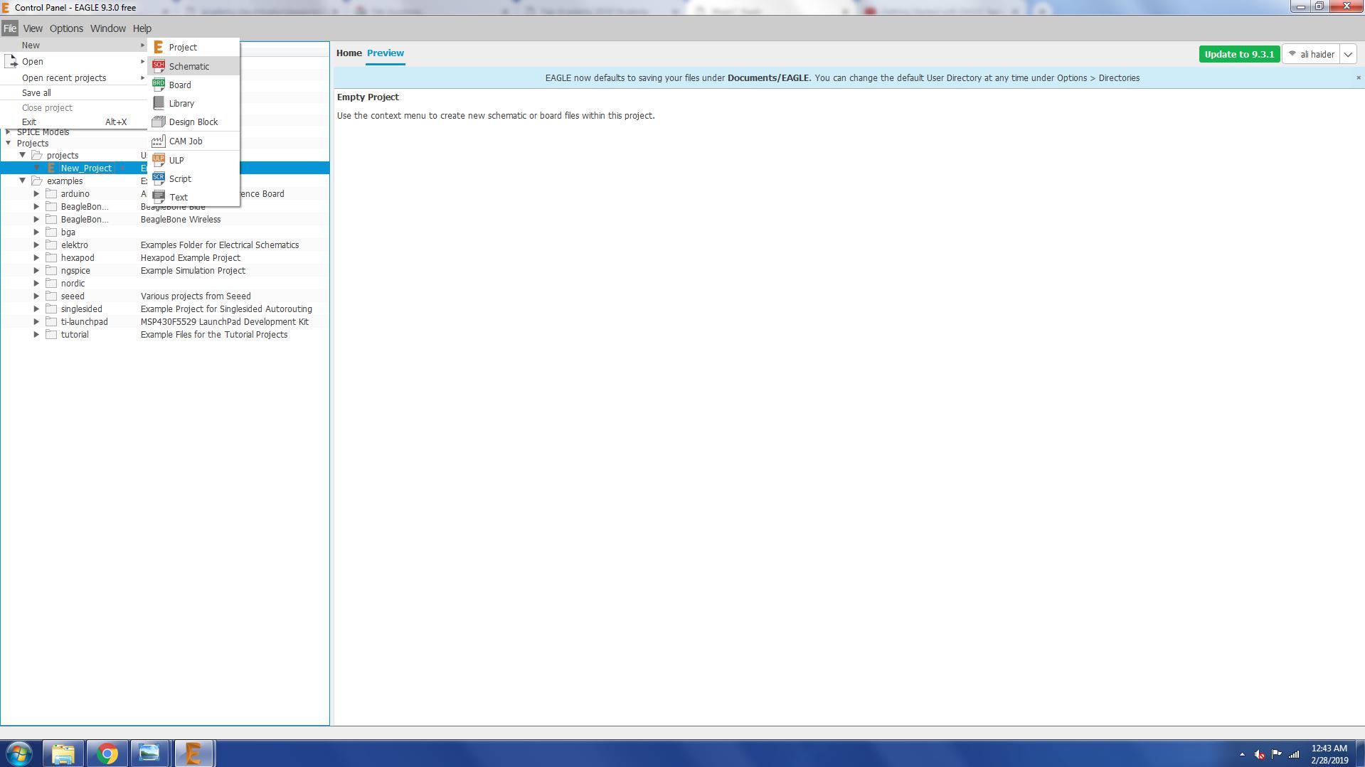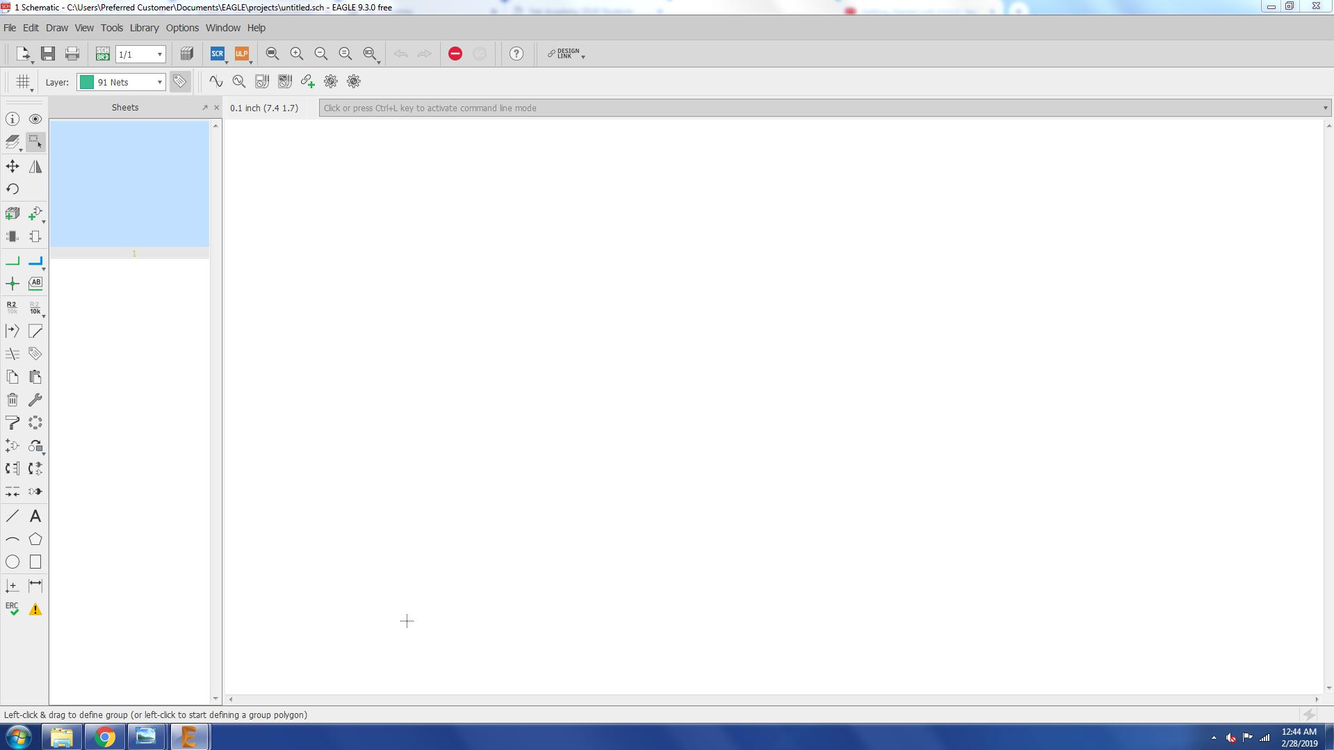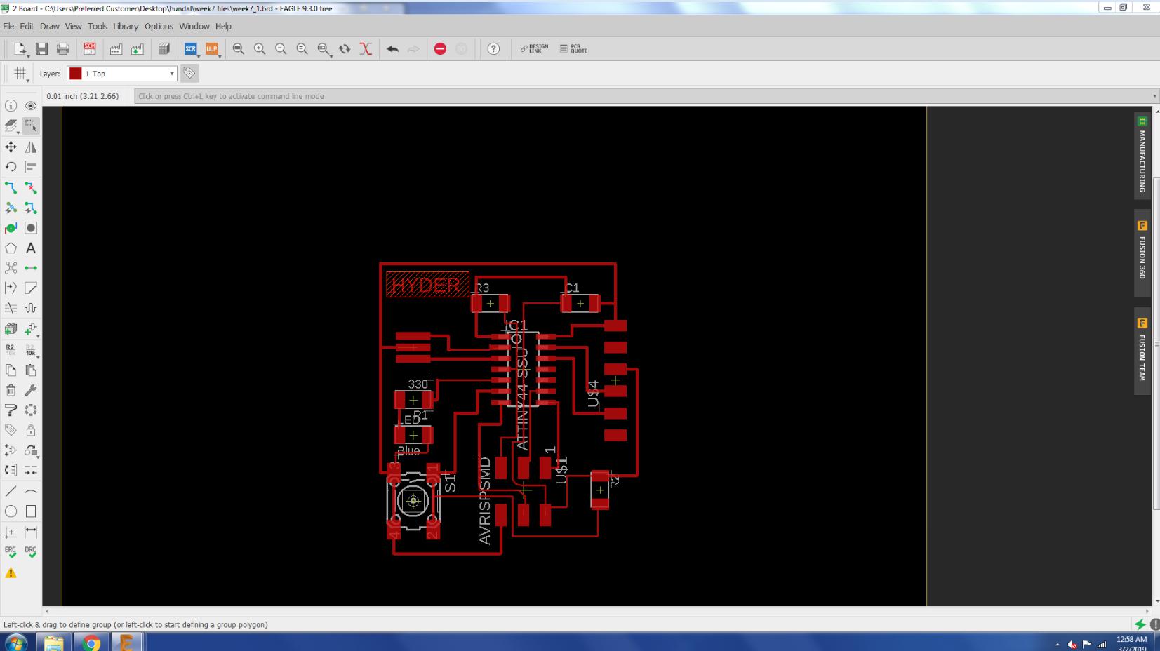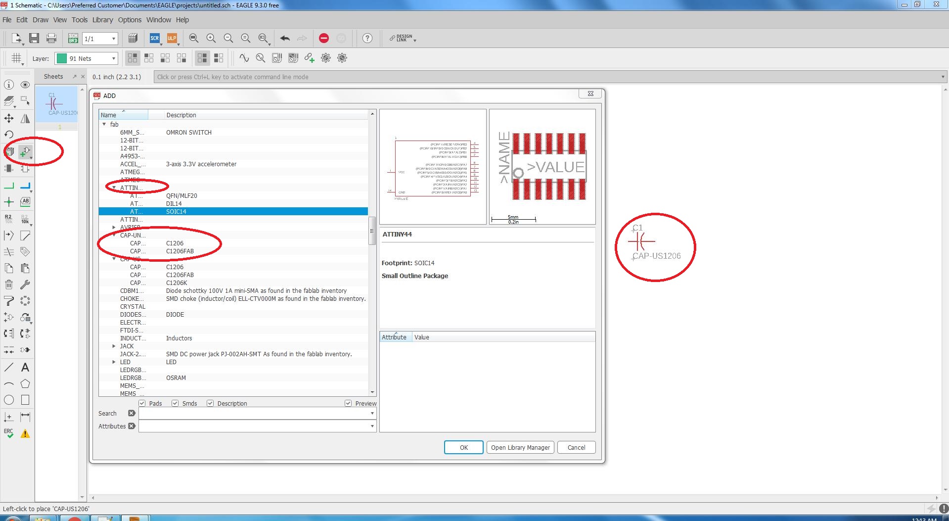 For the schmatic of the hello world board first I have to add the fab library in the library of eagle so I can use the compents from there.