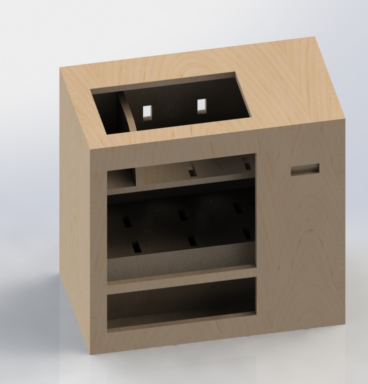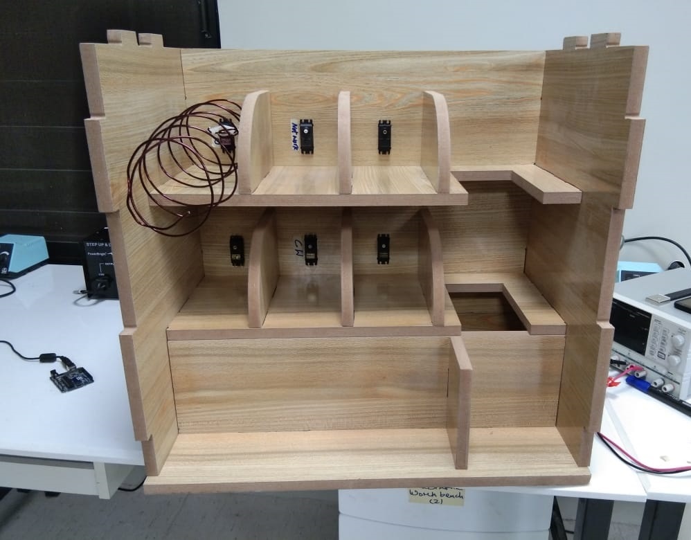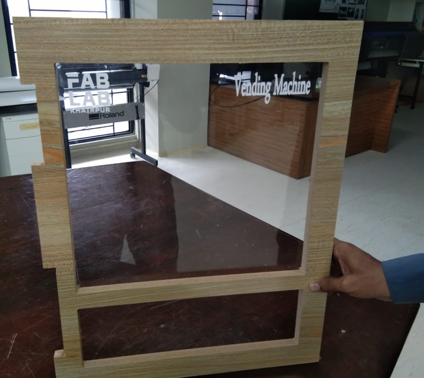 We tried to cut this in shopbot where we used laminated 16mm thick mdf sheet. After cnc milling we assembled this machine in a team and proceeded further. The cutting process and assembly of design is shown figure (a) and (d) respectively. Furthermore we laser cut the front panel which is also shown figure (b) and (c). It was nice experience to work togethor.