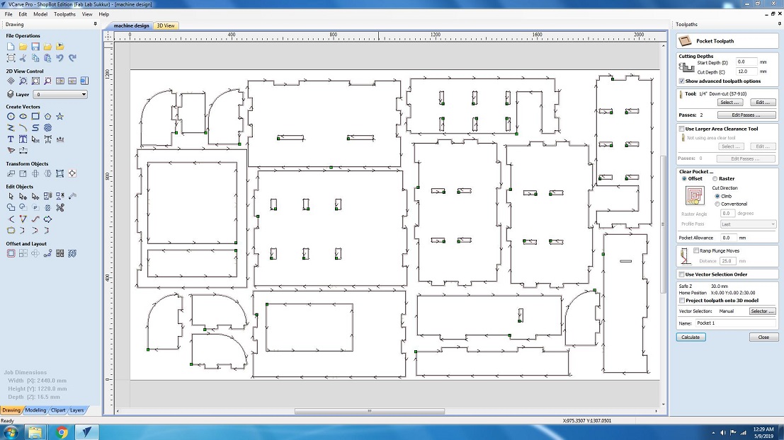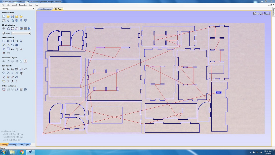 This part was done by our group member Mr. Haider. In cnc milling we normally use vcarve software for generating toolpaths. Before generating any tool path he used dog bones in order to pressfit the design accurately and used tabs at various points just to hook up the parts in mdf card board. Since we are using the Liquid crystal display (LCD) so for that he used pocket toolpath and for cutting he used profile toolpath. The generated pocket tool paths, profile toolpaths and 3d view of toolpaths is shown below in figure(a), (b) and (c) respectively. Furthermore it can also be seen in figure (a) that there is joint between two parts i-e front panel which is minor mistake and was resolved after cnc milling.