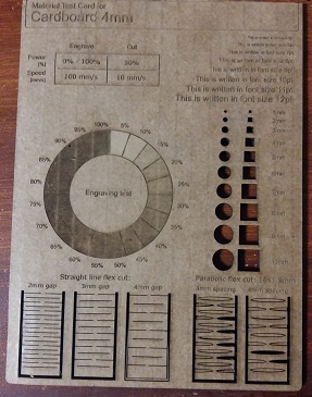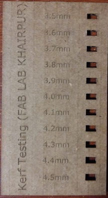 It is my first time to work on American brand laser cutting machine. This is 75 Watt CO2 laser cutting machine with a bed size of 32x20 inches. For group assignment, we are using a material test card which we found from internet. This card is helpful to document the machine performance on any material. We are using 4mm cardboard to test machine parameters. In this test we are checking its engraving power, engraving performance on different font sizes, cutting accuracy by cutting different size shapes and, parabolic and straight line flexes by varying line spacing.For kerf measuring we made a card.