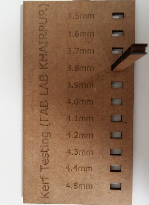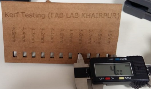The laser burns away a portion of material when it cuts through. This is known as the laser kerf and ranges from 0.08mm – 1mm depending on the material type and other conditional factors. we made a cardboard of different rectangles to find a kerf, in 3.8 mm rectangle we measure the kerf 0.2mm/2=0.1 mm.