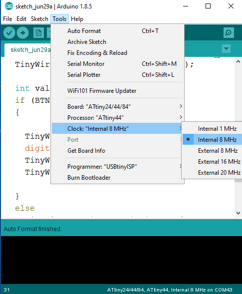 First i tried the Wire.h library that official given by the Arduino. But when compailing the wire.h library i got some error. So i googled and saw some answers from arduino forum that wire.h library wont work with attiny45 microcontrollers. As i xpected it happened. So now, i need to find another way. I searched for alternative arduino libaries that especially build for attiny microcontrollers. I found TinyWire.h library for arduino. The TinyWire.h library is build a for attiny microcontrollers. The library almost replicate the wire.h but stil i face some problems, so i try to edit library files. we edit somvalues in library. and i found that now its working with 8MHZ internal crystal. i use 20Mhz oscilator in my boards, its not working in that frequency range. i dont know why?