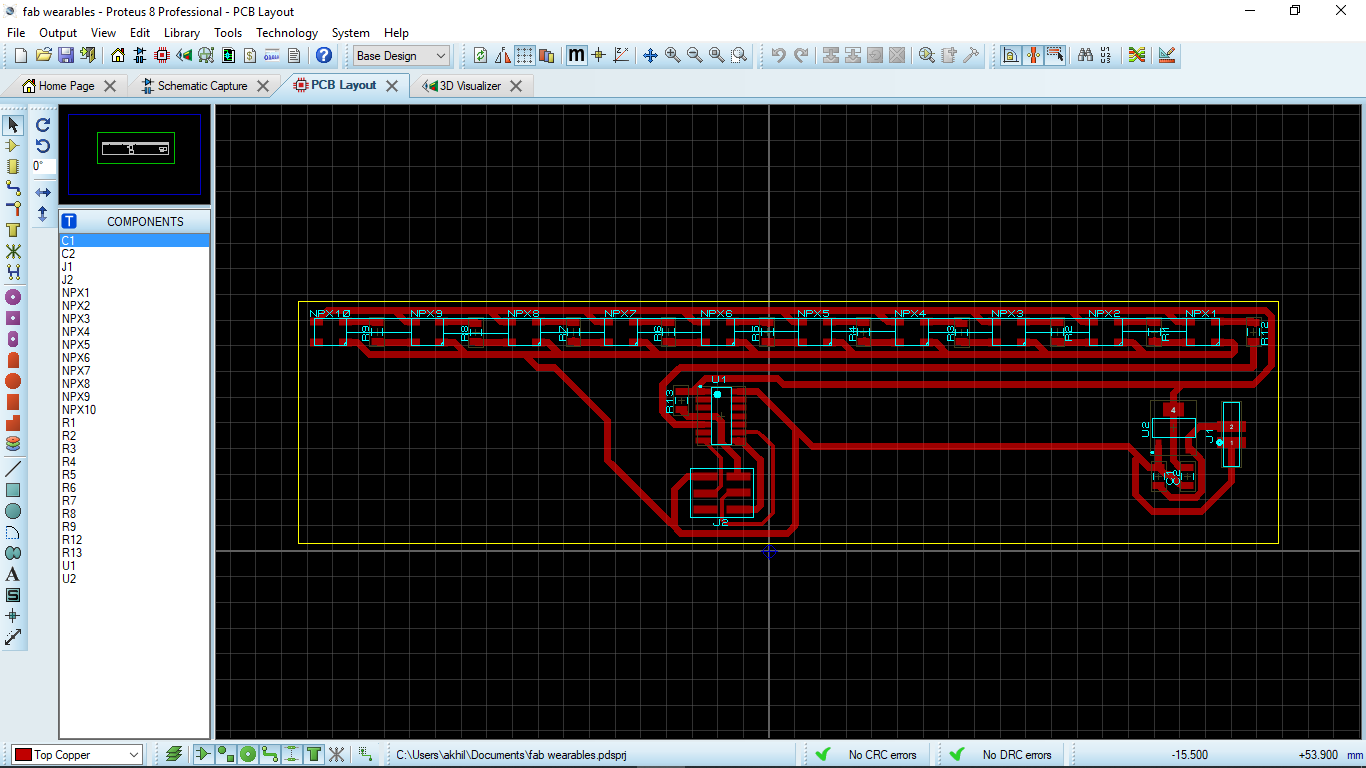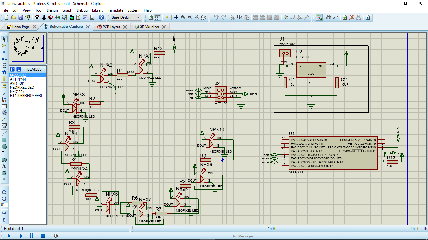 First i need to design the schematics. I started designing the schematics using proteus PCB. I used a Attiny44 Microcontroller. I have enough pins to conect all my LEDs and the sensor. I used NEOPIXEL LEDs. Its multi color LEDs and also can be addressable. So i need jst one pin to control full LEDs. i use 10 LEDs.I removed the ISP programing head because i just program them once. so i decided to remove them to avoide complexity in routing. I placed a 2x2 pin header to power the board externaly from a battery.