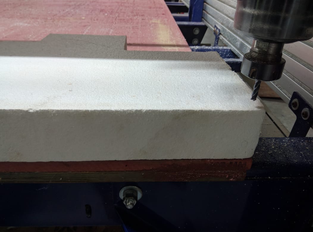 The i cut in thermocall by shop boat. The thermocal cant screw in shopboat bed, so i stick it on bed using a doublesided tape. Then we need ro set origin,z-axis setting, toolpath generation ..etc