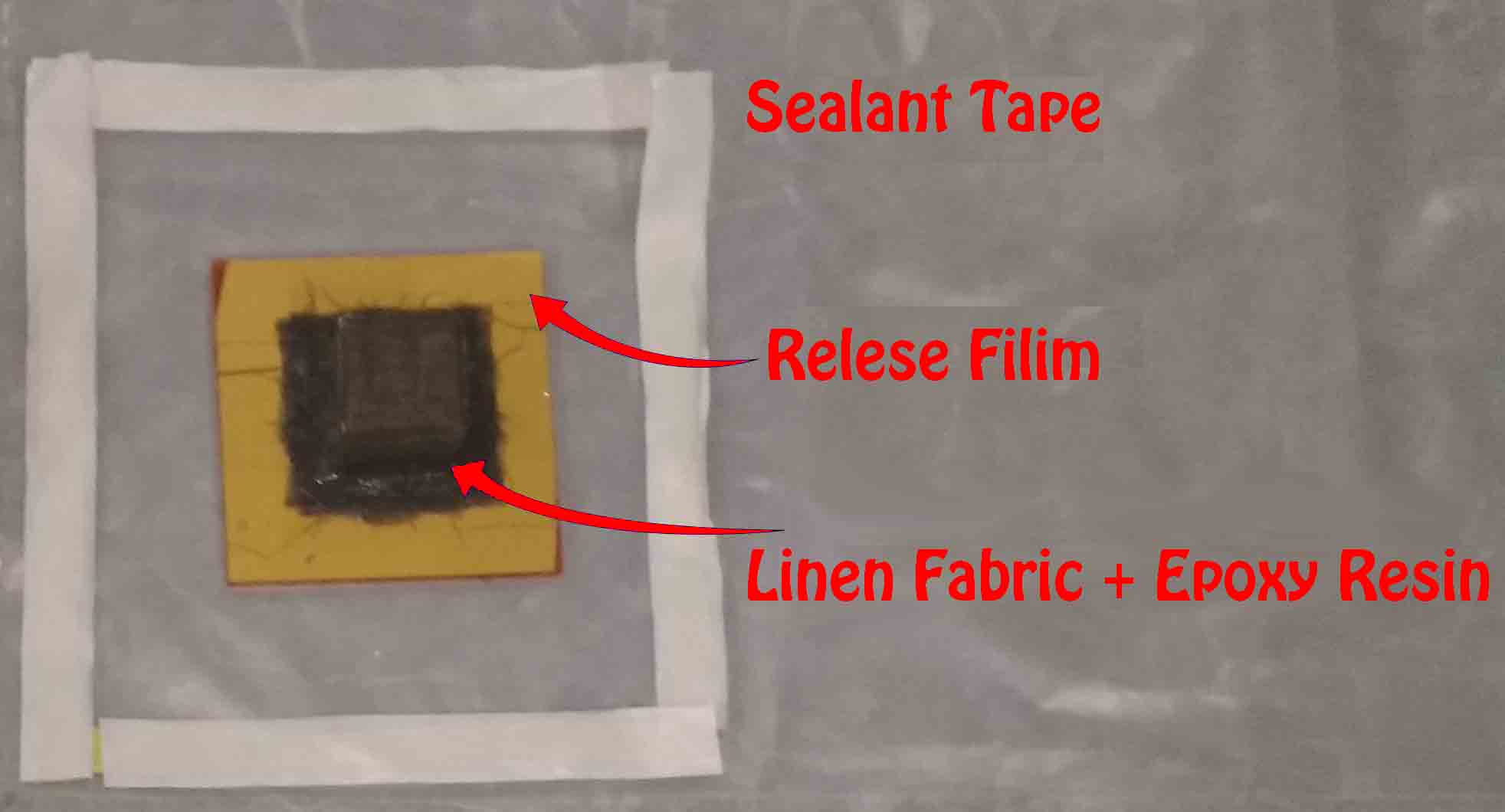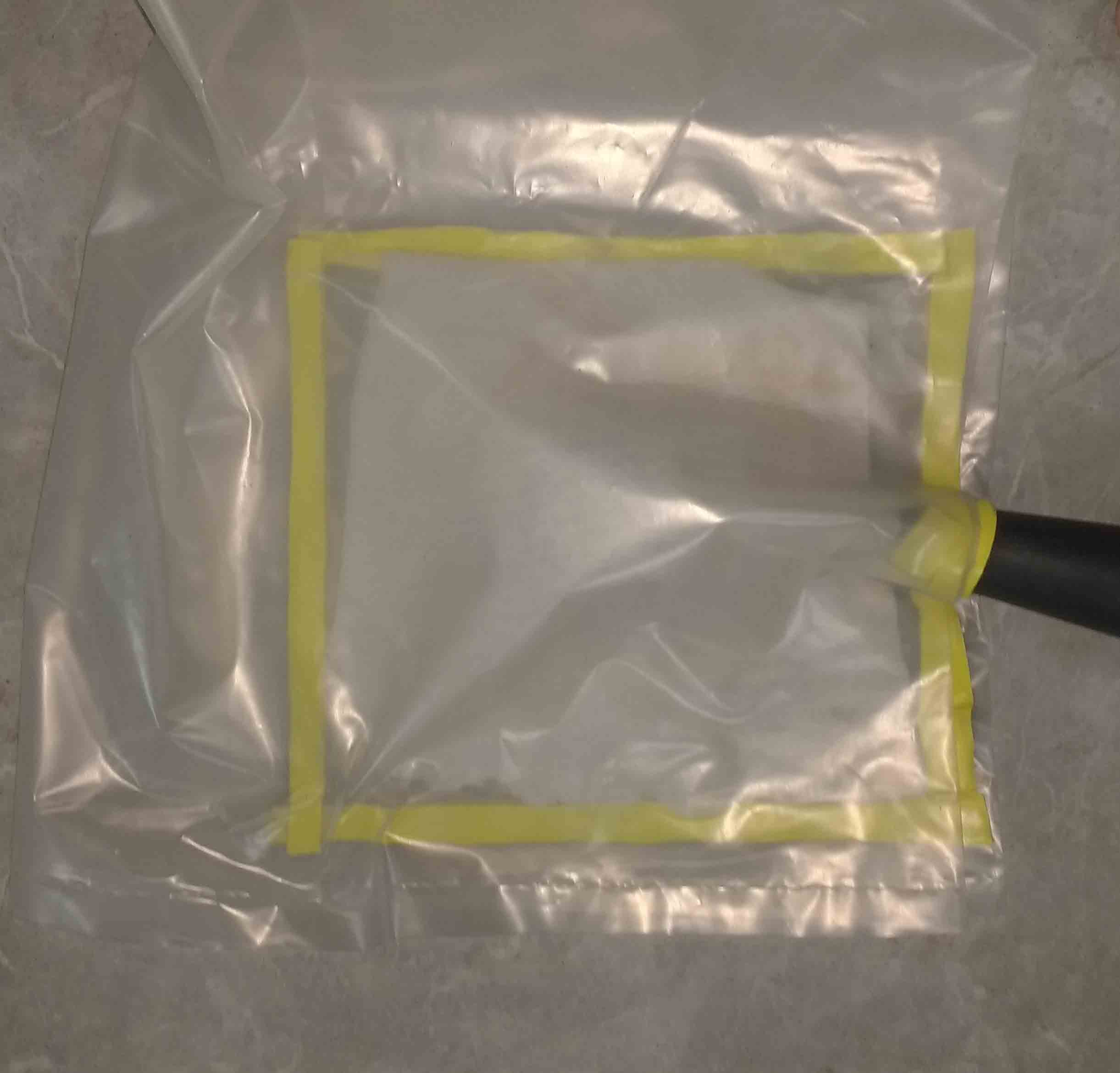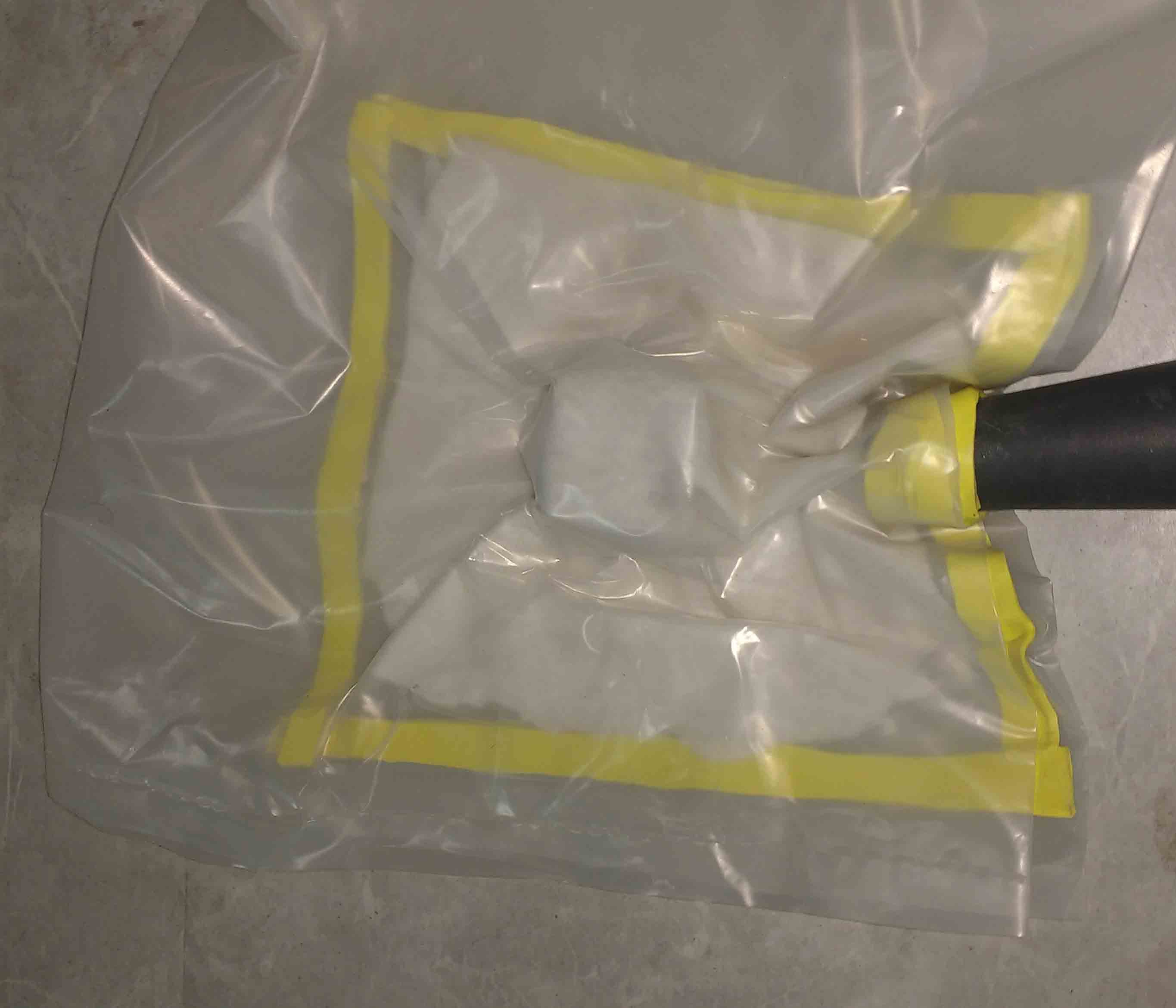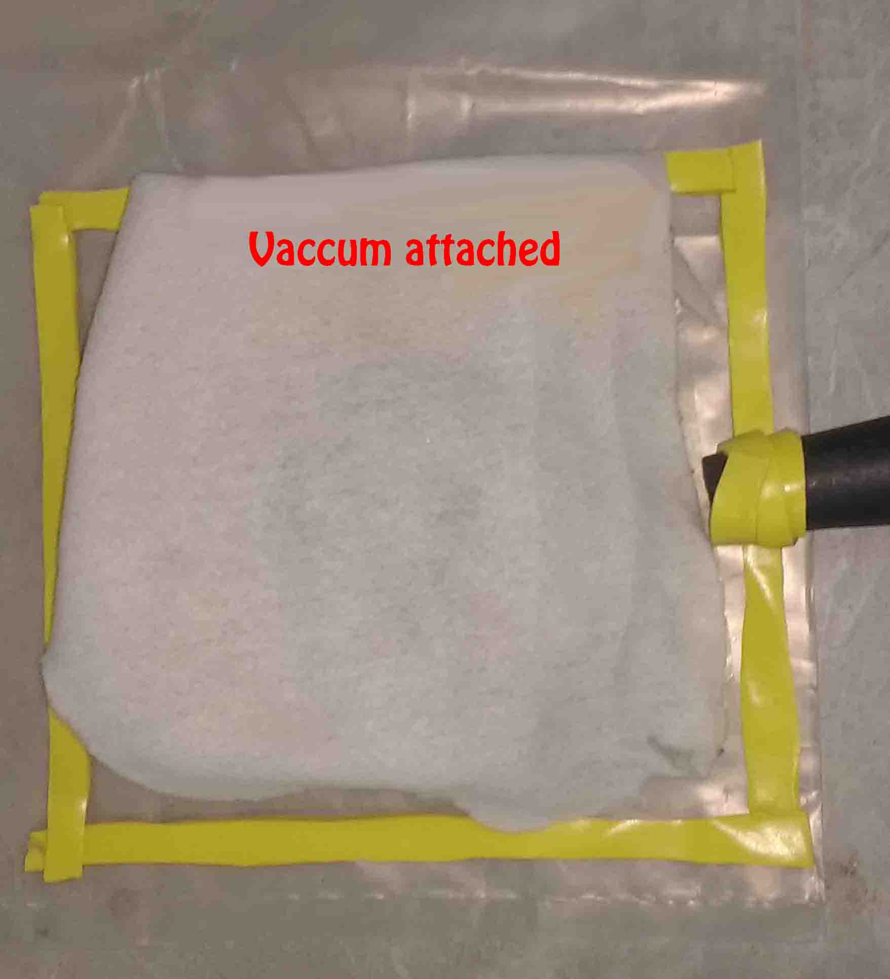 Place the mold and composite on the preset vacuum bag.The bag shoulg be prepared befor mixing the resing . It will ease the vacuuming process to suck excess resin from the composite.