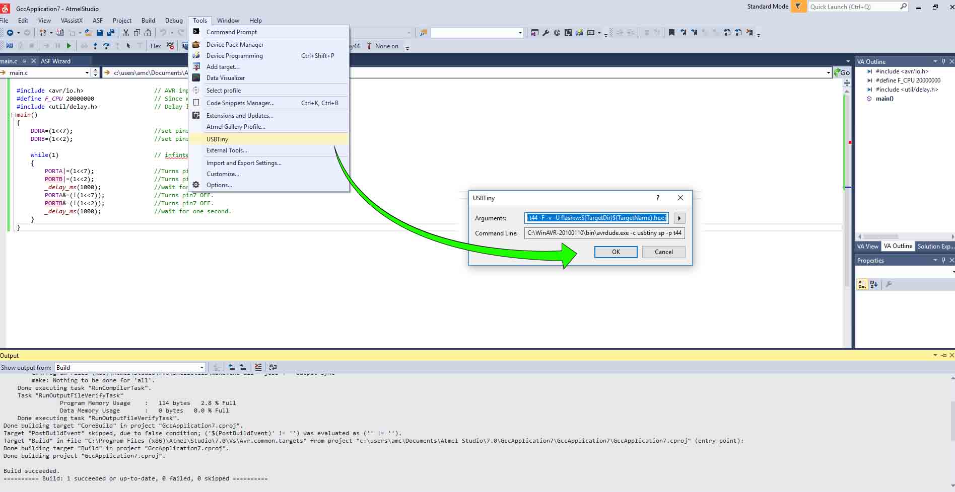 -c usbtiny sp -p t44 -F -v -U flash:w:$(TargetDir)$(TargetName).hex:iin the argument space