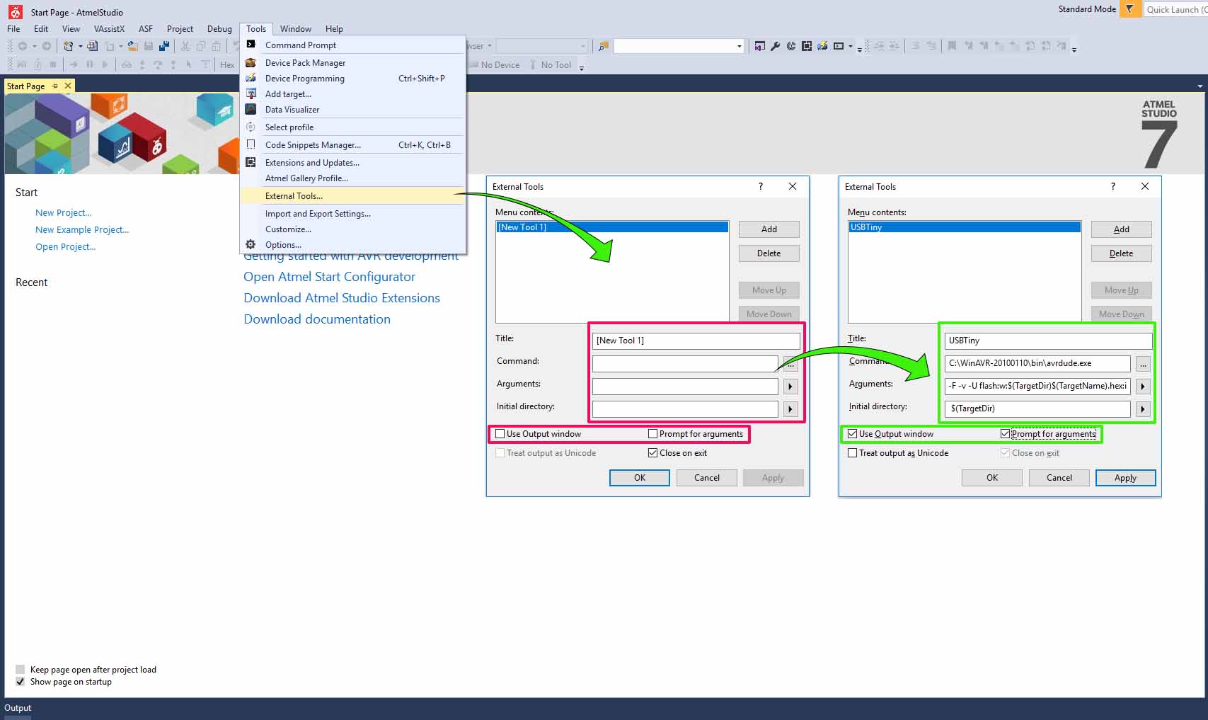 Next we have to add our programmer to our enviournment. Choose Tools -> External Tools -> Fill the spaces as shown below. Put this