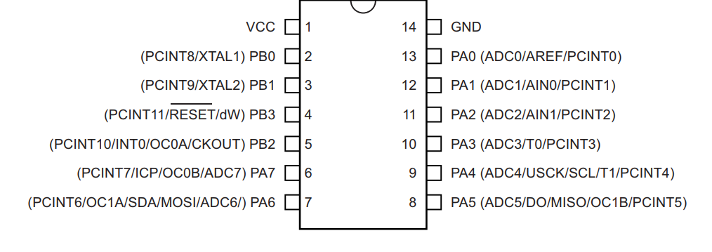 The Atmel ATtiny24/44/84 provides the following features: 2/4/8K bytes of in-system programmable flash, 128/256/512 bytes EEPROM, 128/256/512 bytes SRAM, 12 general purpose I/O lines, 32 general purpose working registers, an 8-bit Timer/Counter with two PWM channels, a 16-bit Timer/Counter with two PWM channels, internal and external interrupts, an 8-channel 10-bit ADC, programmable gain stage (1x, 20x) for 12 differential ADC channel pairs, a programmable watchdog timer with internal oscillator, internal calibrated oscillator, and three software selectable power saving modes
