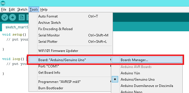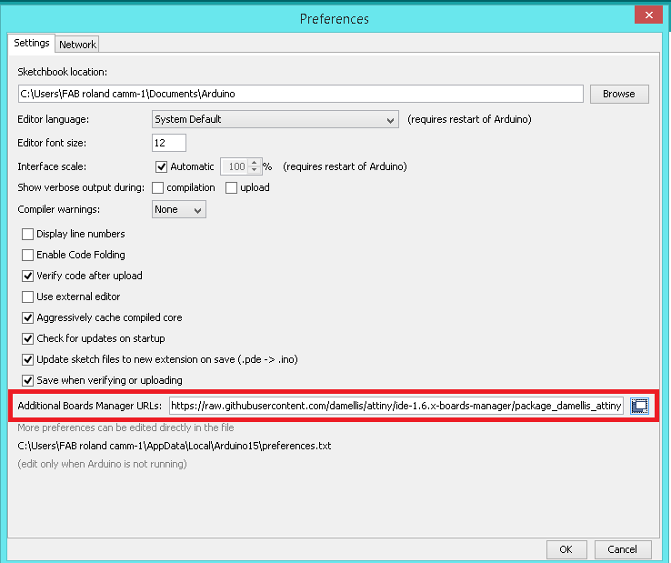 https://raw.githubusercontent.com/damellis/attiny/ide-1.6.x-boards manager/package_damellis_attiny_index.json - After adding the URL open Board Manager by clicking