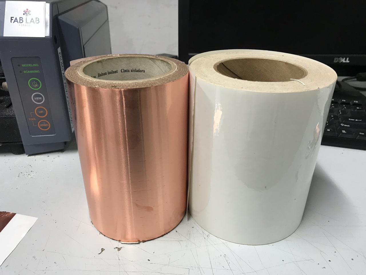 Peeling the small parts after cutting is very difficult. Instead I peeled copper sheet an sticked on white tape am=ns milled it.