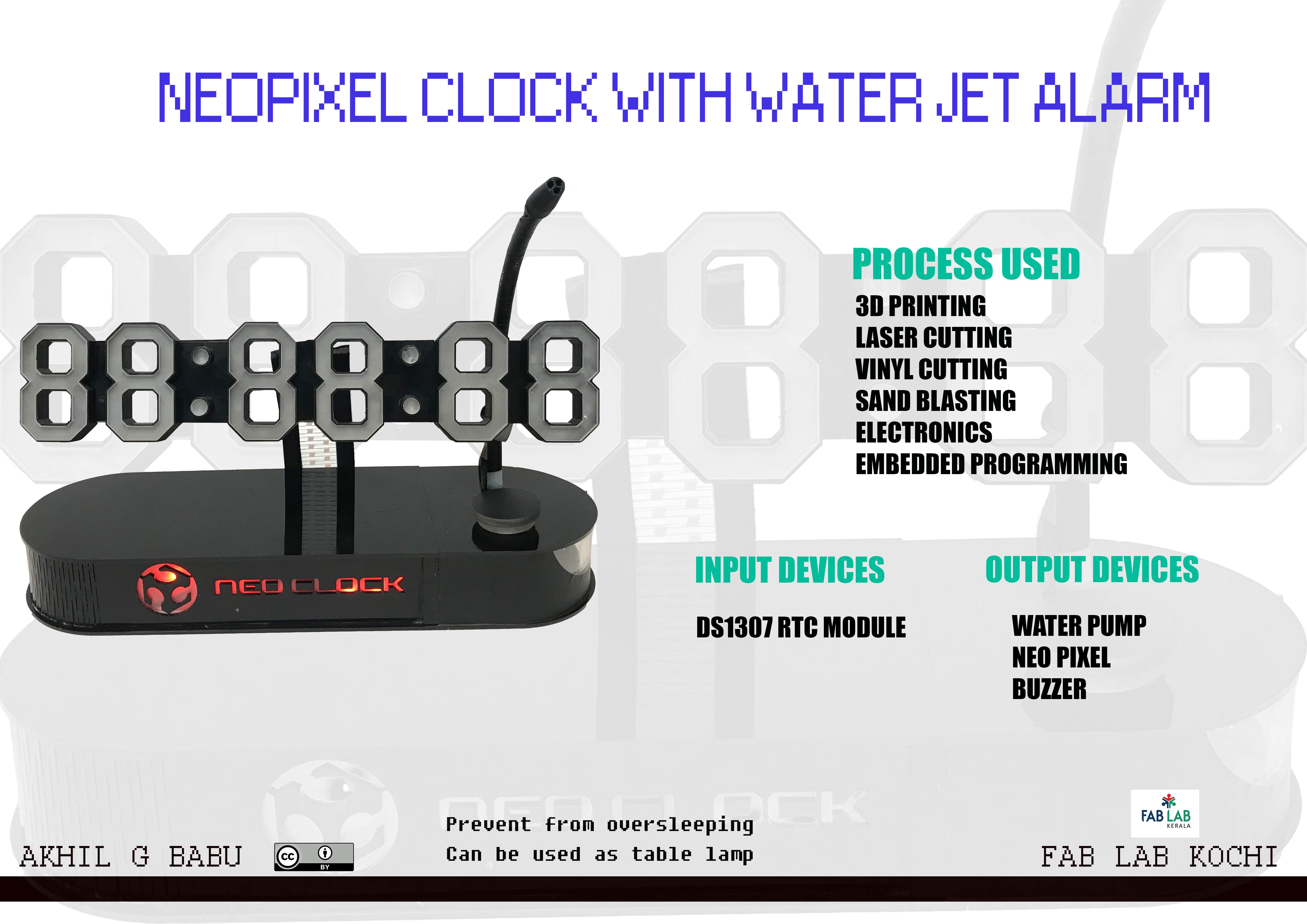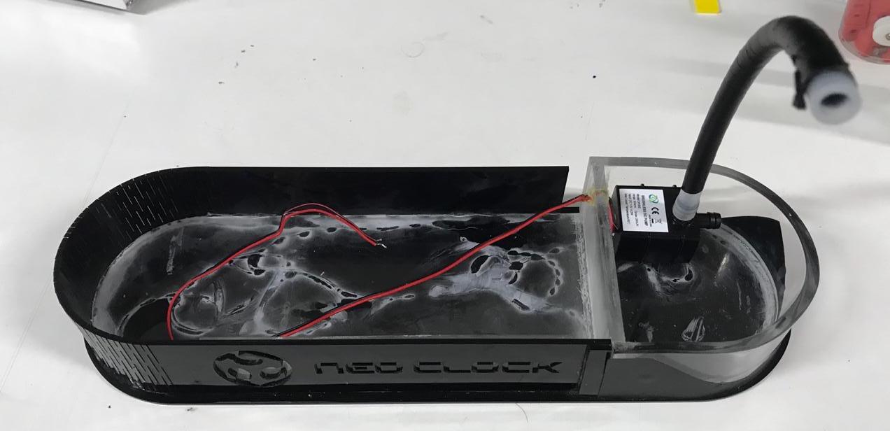 Neo clock is a water spray alarm clock which comprises an alarm clock body made using acrylic and 3d print, a water reservoir, a water spray nozzle, a water spray pump water pipe, a control circuit board.Tthe control circuit board is used for controlling, when the alarm clock alarms for one minute, but the stop button is not pressed down in the mobile app, the water spray device sprays water through the water spray pipe, so a user is awakened from a sleeping state, and is prevented from oversleeping.