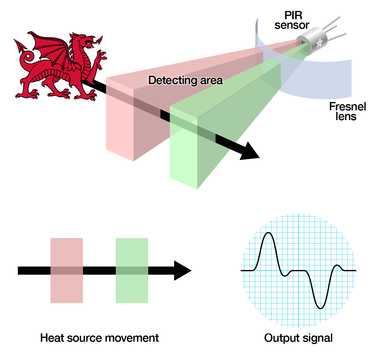 PIR sensors are more complicated than many of the other sensors explained in these tutorials (like photocells, FSRs and tilt switches) because there are multiple variables that affect the sensors input and output. To begin explaining how a basic sensor works, we'll use this rather nice diagram The PIR sensor itself has two slots in it, each slot is made of a special material that is sensitive to IR. The lens used here is not really doing much and so we see that the two slots can 'see' out past some distance (basically the sensitivity of the sensor). When the sensor is idle, both slots detect the same amount of IR, the ambient amount radiated from the room or walls or outdoors. When a warm body like a human or animal passes by, it first intercepts one half of the PIR sensor, which causes a positive differential change between the two halves. When the warm body leaves the sensing area, the reverse happens, whereby the sensor generates a negative differential change. These change pulses are what is detected.
