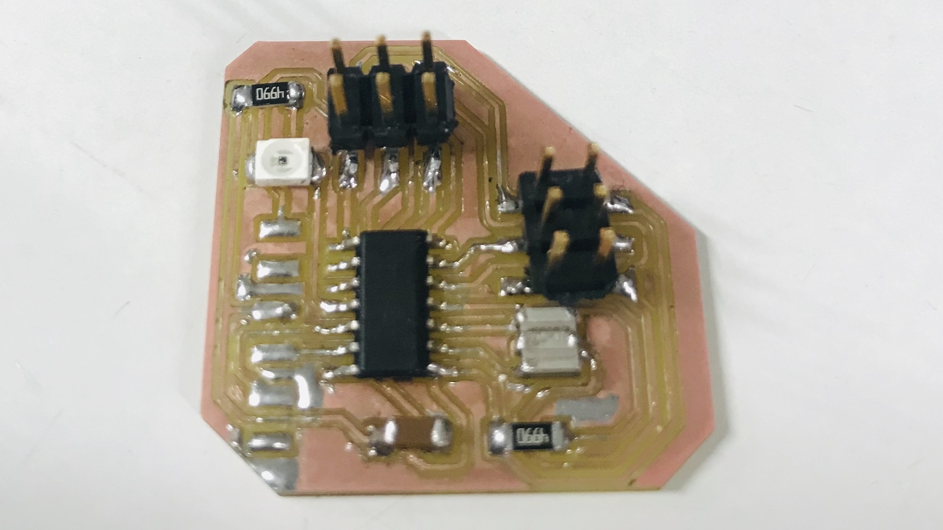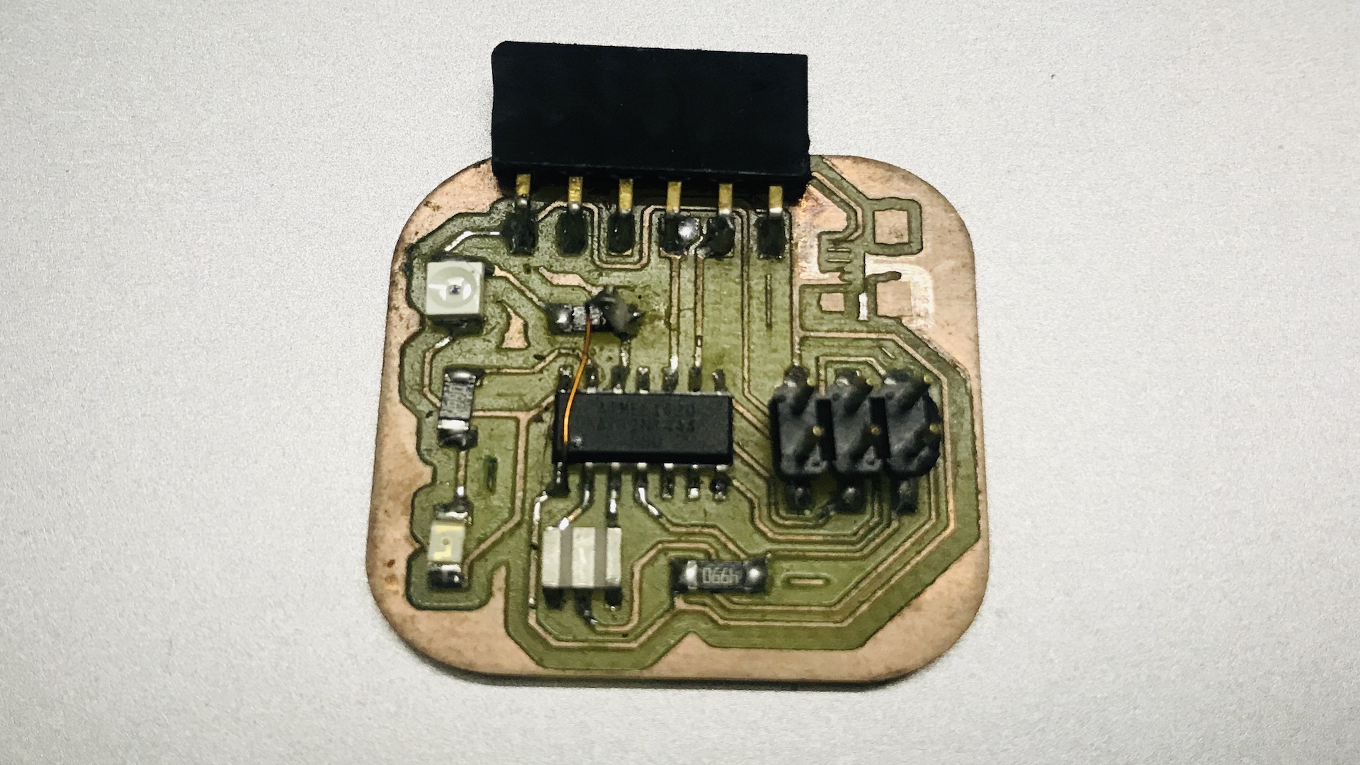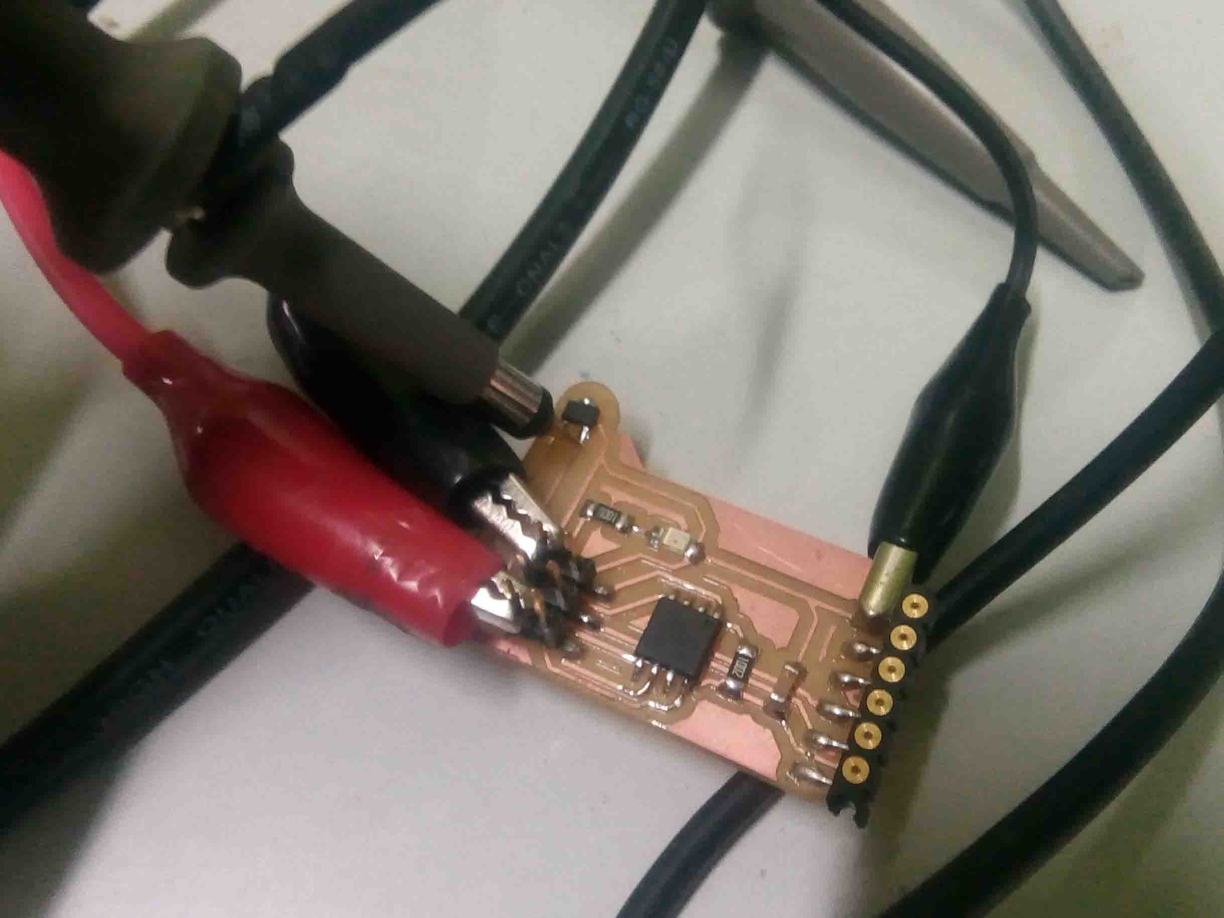finally made the pcb. This is the finished circuit board. When I tried to program the board, the ISP cannot detect it. This PCB is also not working. I found one issue with the board, and added pull up resister in the the circuit. I added it using a jumper wire. Even after adding that the circuit was not working.