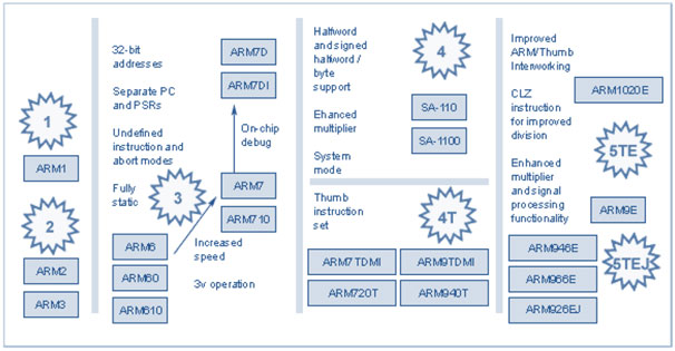 In Thumb 2, the compiler automatically selects a mixture of 16 bit and 32 bit instructions. It is to be noted that only the instruction set changes from 32 bit to 16 bit, the core continues to operate at 32 bit. The evolution of ARM v7 cores saw the development of Thumb Execution Environment (Thumb-EE) which offered dynamic coding by compiling the code moments before or during execution itself. Thumb feature is basically another Instruction Set running on the same platform. Another Instruction set, to execute Java codes on ARMs was developed soon and was named Jazelle. These three Instruction sets are now the three states on an ARM core and to shift from one state to another, directives like ARM, THUMBX and THUMB are given to the assembler. The evolution of ARM architectures is shown in the figure below: