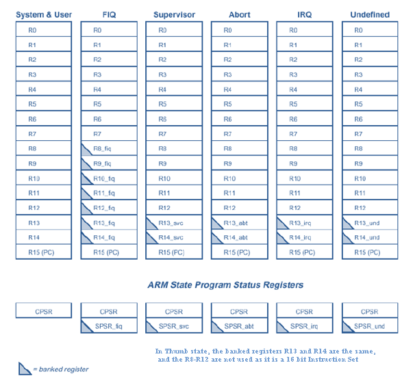 In general ARMs have 37 registers arranged in partially overlapping banks, with separate register banks for each processor mode thus providing rapid context switching for special operations. The various modes in an ARM can be summarized in the figure below.