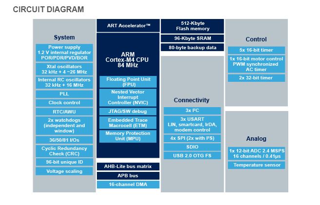 The MCUs deliver the performance of Cortex®-M4 core with floating point unit, running at 84 MHz, while achieving outstandingly low power consumption values in run and stop modes.