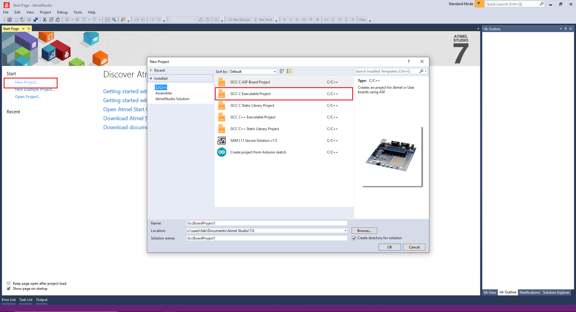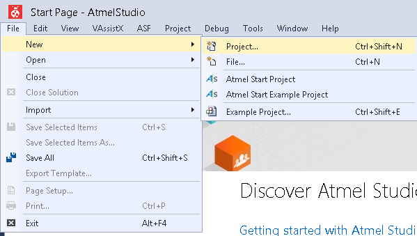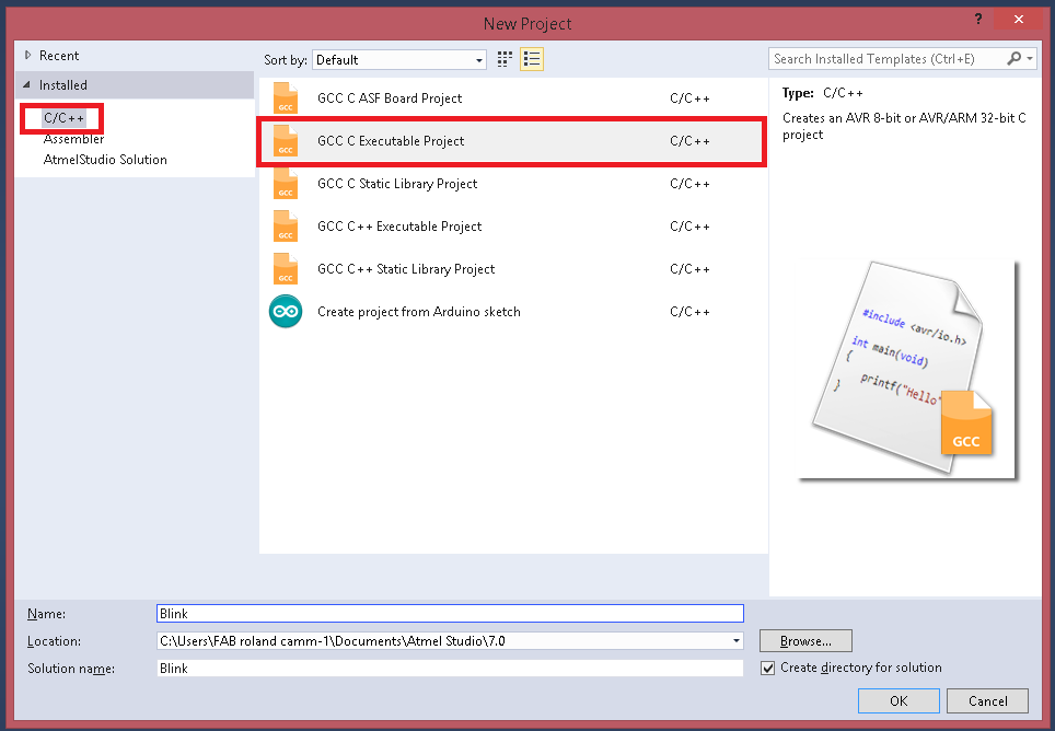 For programming first install and open ATMEL STUDIO. Click "New Project" and select"GCC C Exictable project". Click ok to confirm the selection
