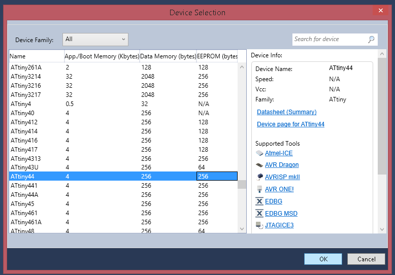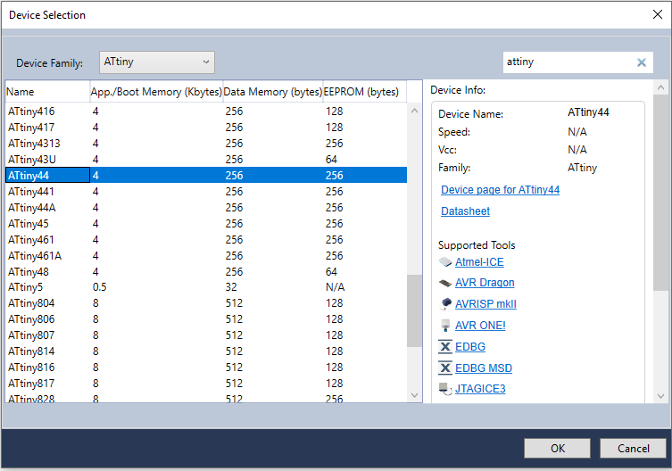 Now you can see the following window. Select device famiy as Attiny and select Attint 44. Click ok to confirm the operation.