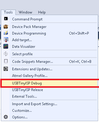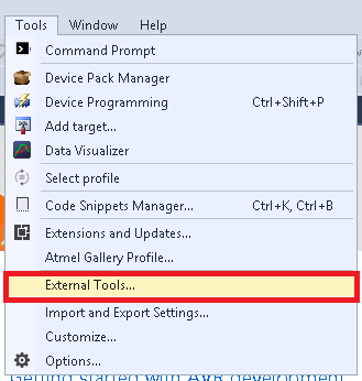 Now we need to setup some parameters for usbtiny debugging. For that Go to "Tools" and Select "External Tools."
