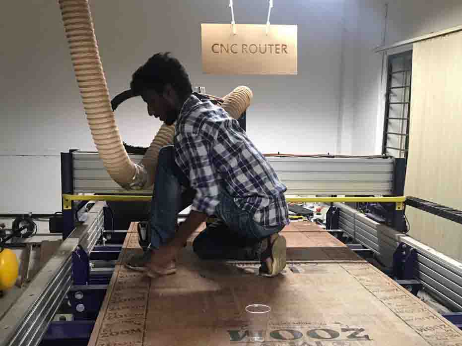 Now we need to cut the whole parts using a CNC machine. As I did in the Week 8 I loaded a 2440mm x 1220mm x 12mm wood on to the machine