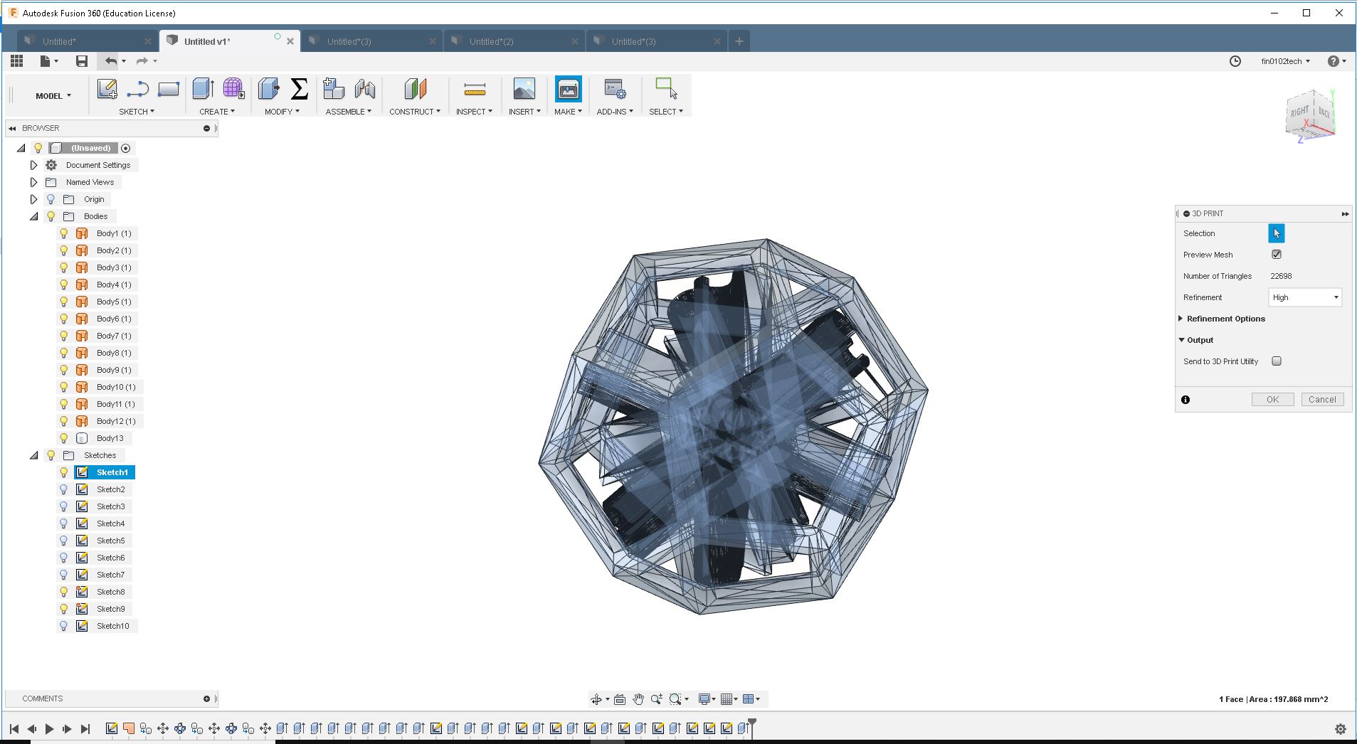Now I have to make it a .stl file. For that I clicked "3d Print" under "Make" option in menu.Then a box pops up. Select the shape and click "Ok"