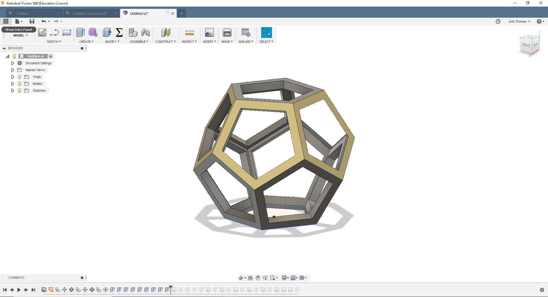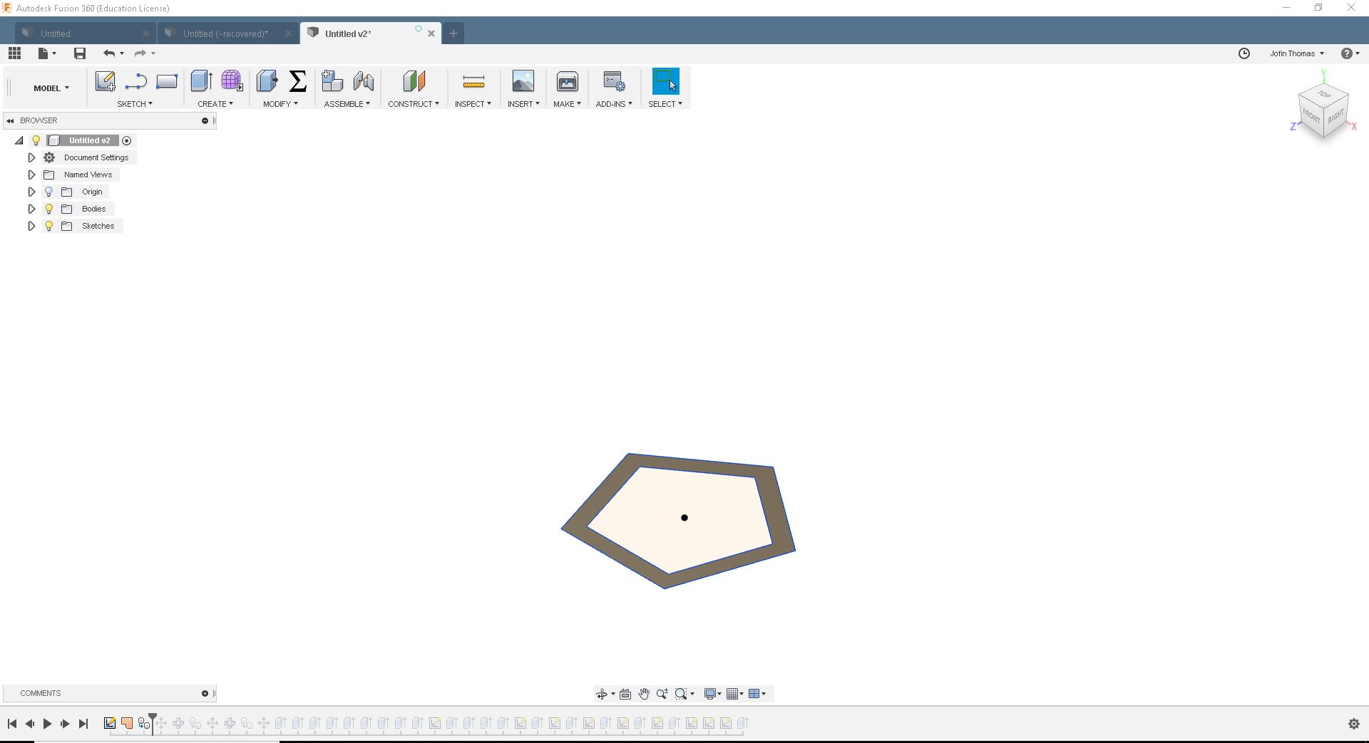 I needed a solid piece. For that I return to "Model" and extrude each body with the thickness of 10mm. I had make sure that each body will join with an other