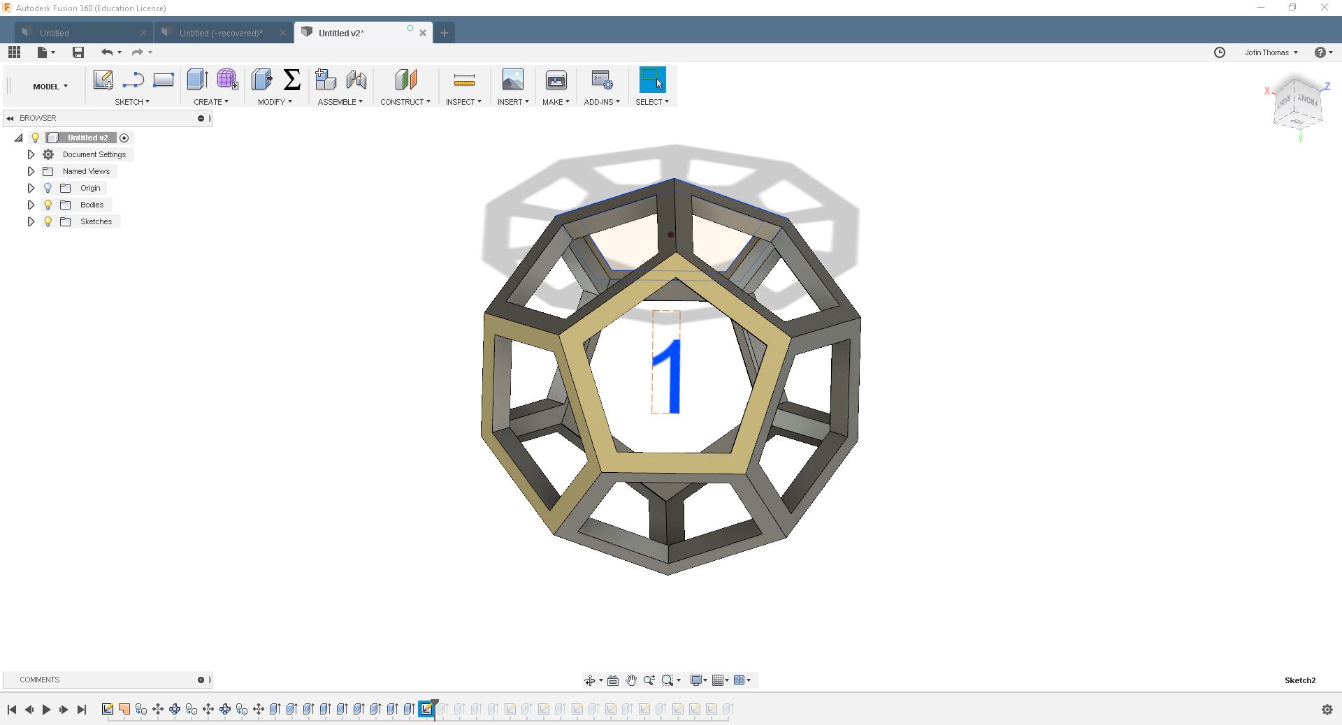 For creating the digit part, I select new sketch and selected a face of the dodecahedron. Drew number 1 and extrude it to the end of the opposite face of rhe dodecahedron. I repeat the same process for the next 5 digits as well. It looked like below: