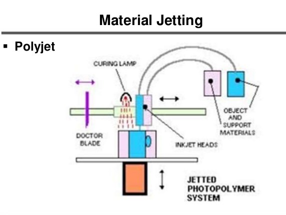 Material Jetting (MJ) works in a similar way to a standard inkjet printer. The key difference is that, instead of printing a single layer of ink, multiple layers are built upon each other to create a solid part. The print head jets hundreds of tiny droplets of photopolymer and then cures/solidifies them using an ultraviolet (UV) light. After one layer has been deposited and cured, the build platform is lowered down one layer thickness and the process is repeated to build up a 3D object. MJ is different from other types of 3D printing technology that deposit, sinter or cure build material using point-wise deposition. Instead of using a single point to follow a path which outlines the cross-sectional area of a layer, MJ machines deposit build material in a rapid, line-wise fashion.